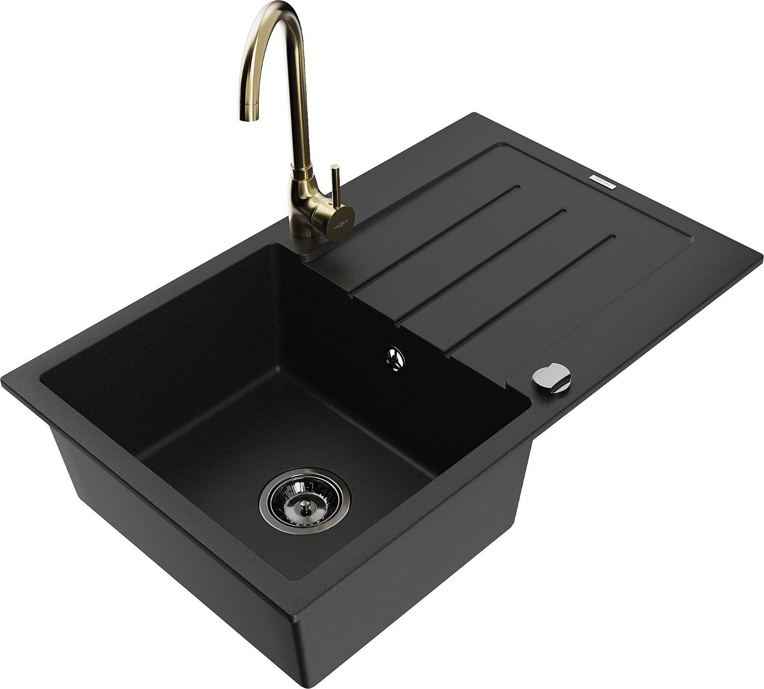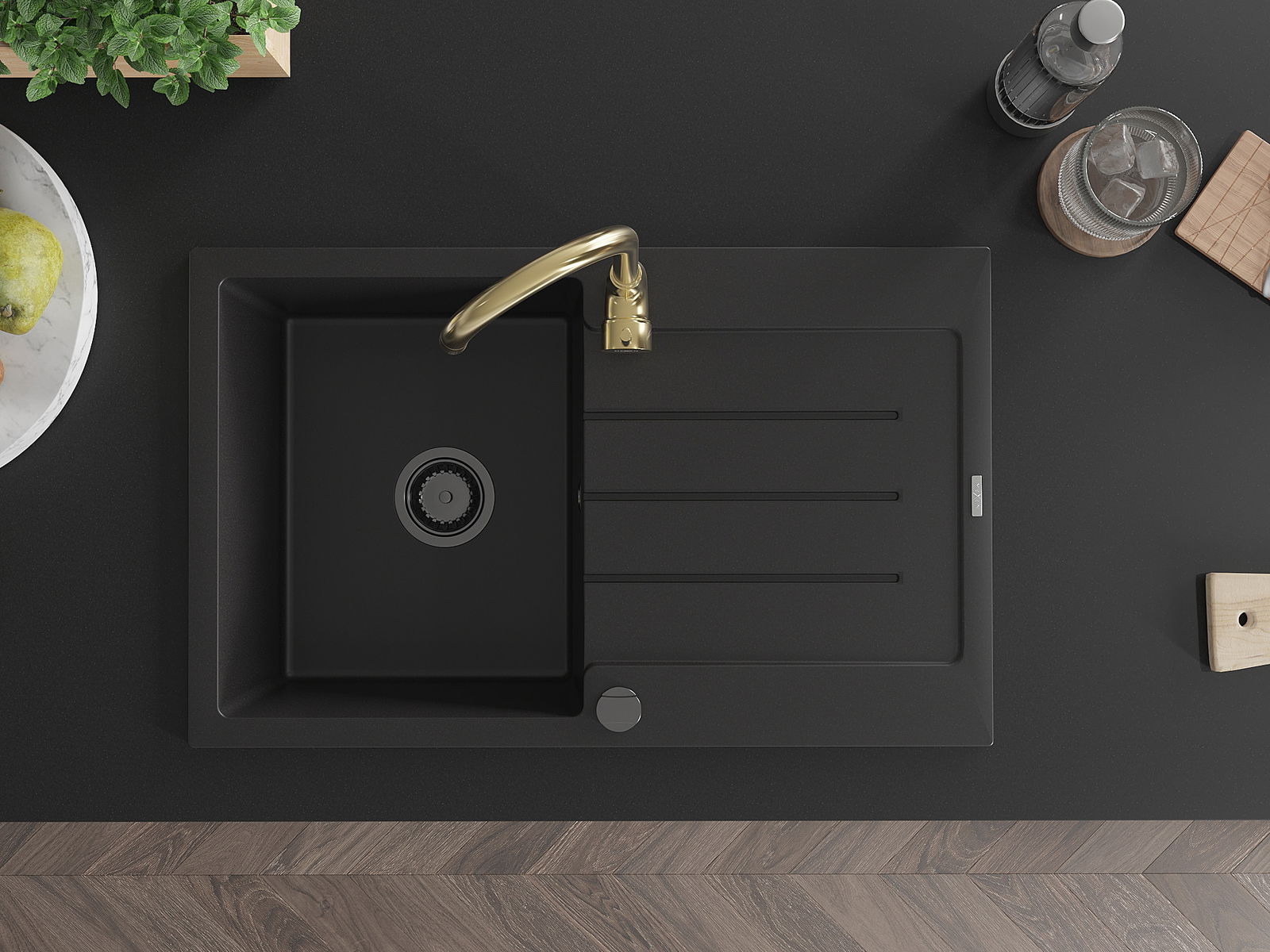 Mexen Bruno gránit mosogató 1-medencés csepegtetővel és Telma konyhai csapteleppel, fekete - 6513-77-670200-50-B