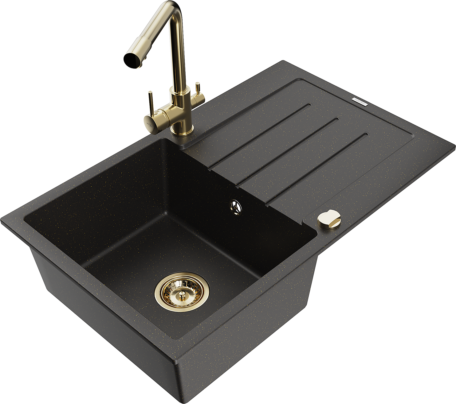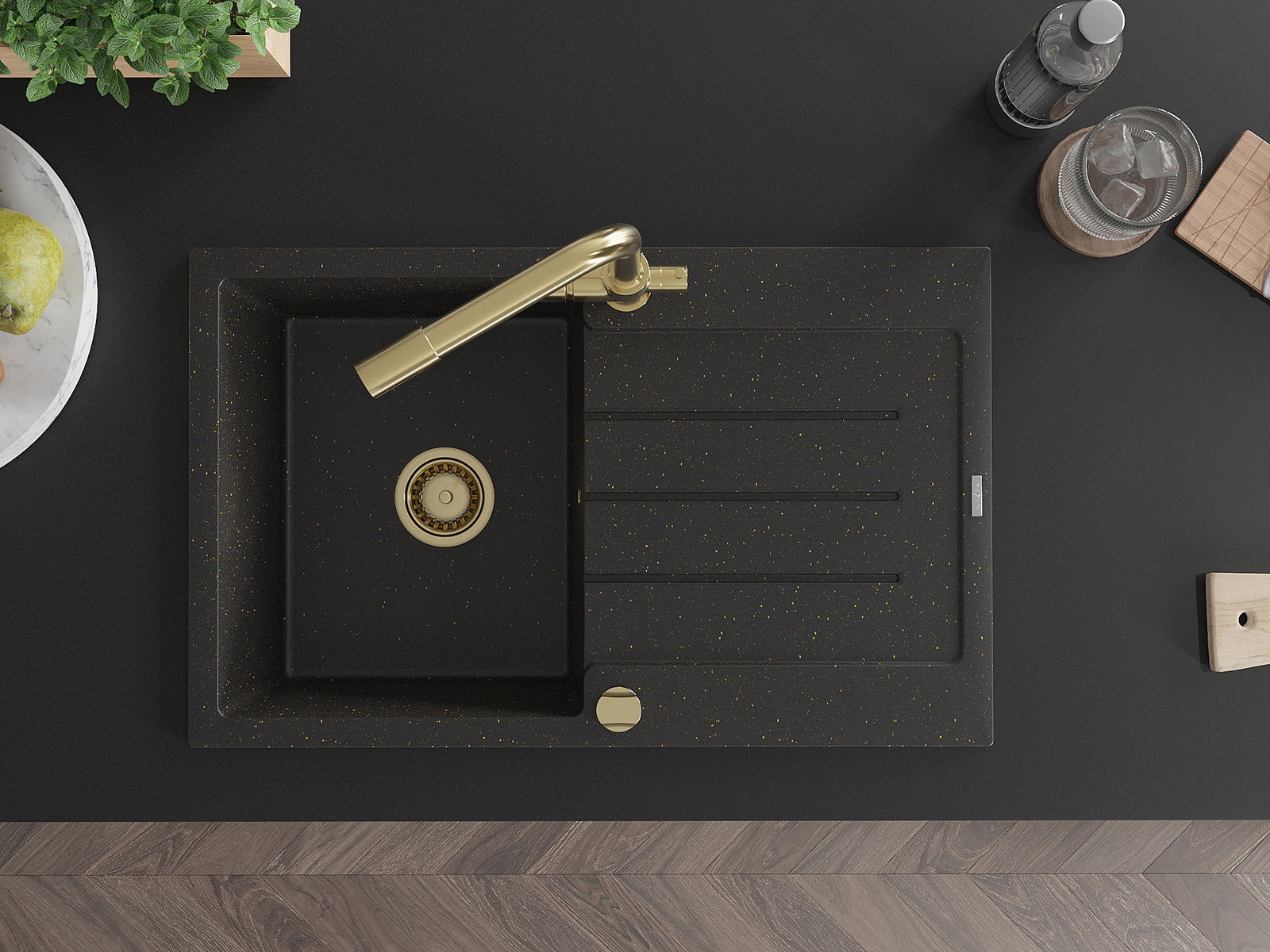 Mexen Bruno egymedencés gránit mosogató csepegtetővel és Duero konyhai csapteleppel, fekete/arany metál - 6513-75-671600-50
