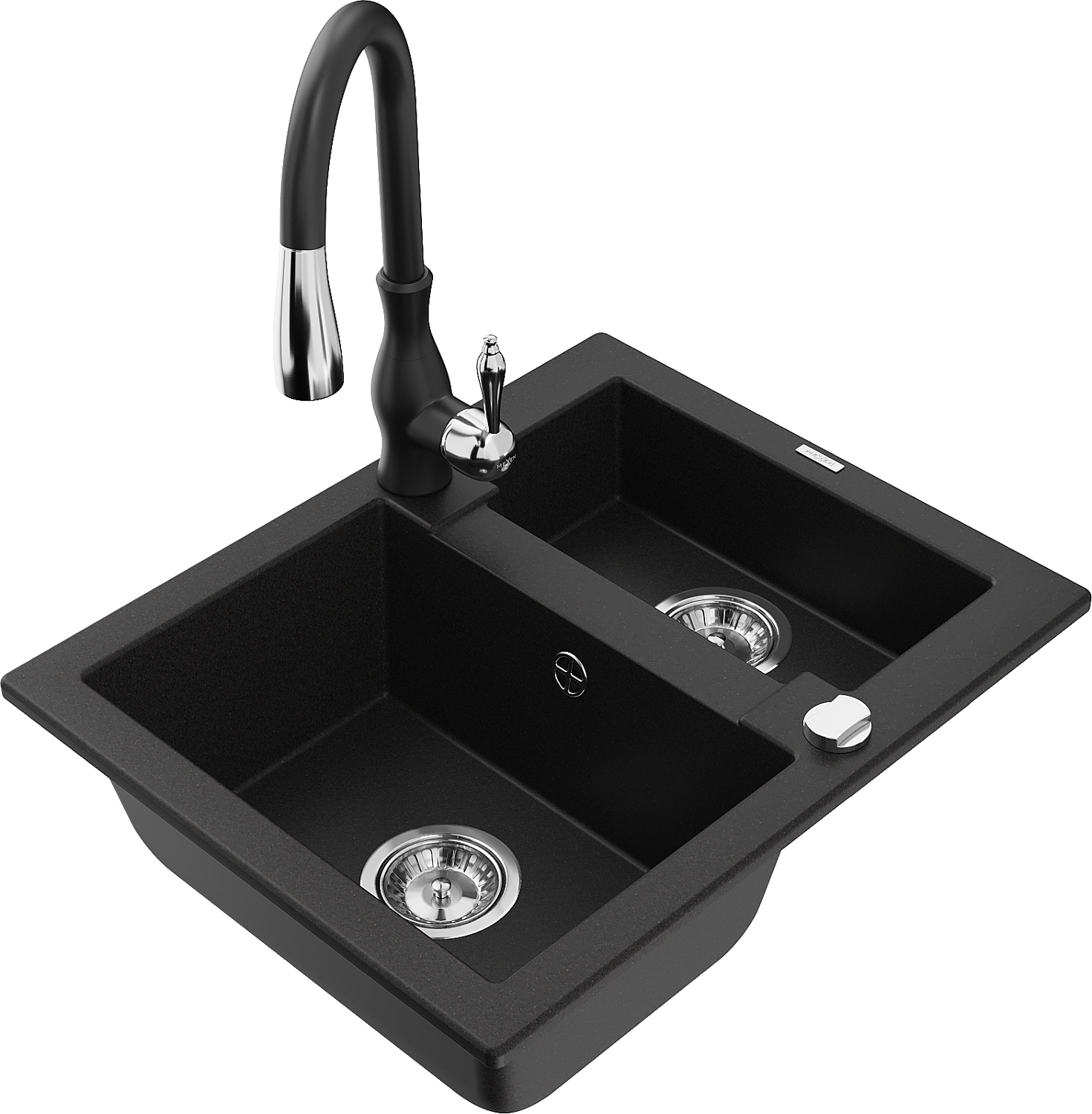 Mexen Carlos gránit mosogatótálca 1,5 medencés konyhai csappal Savita, fekete - 6518-77-672601-70