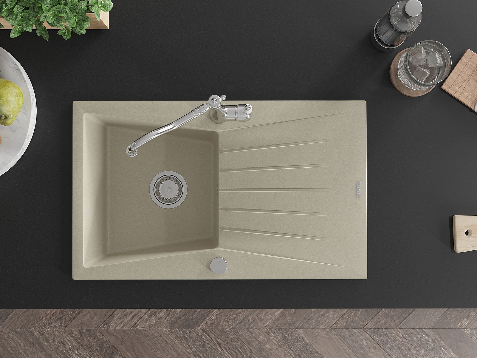 A mosogató kiváló minőségű gránitból készül. Ez egy elegáns és mindenekelőtt minden konyhához praktikus kiegészítés, stílusától függetlenül. A kiváló minőségű és a gránit tartósság biztosítja a sok éves használatát.