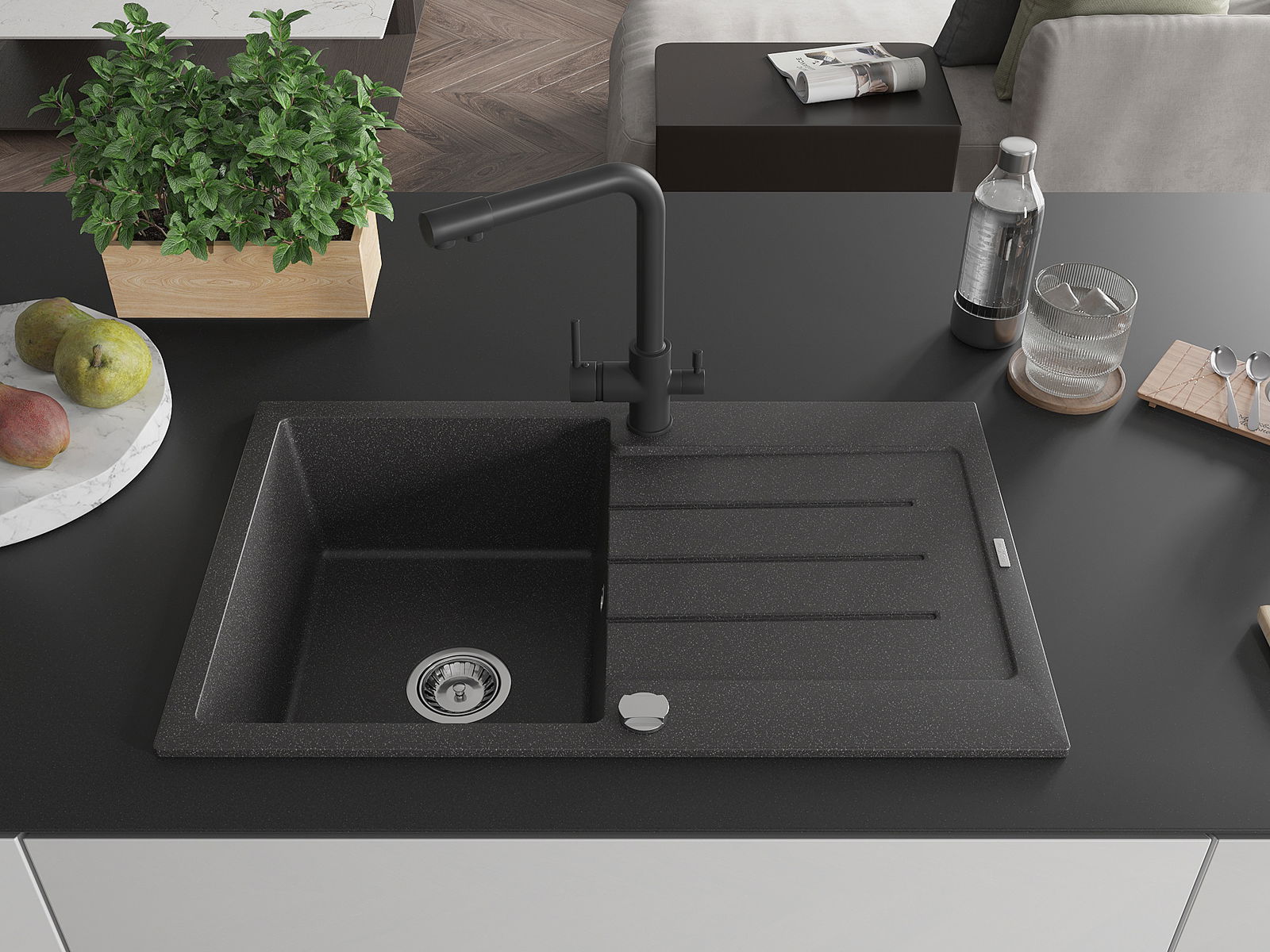 A mosogató kiváló minőségű gránitból készül. Ez egy elegáns és mindenekelőtt minden konyhához praktikus kiegészítés, stílusától függetlenül. A kiváló minőségű és a gránit tartósság biztosítja a sok éves használatát.