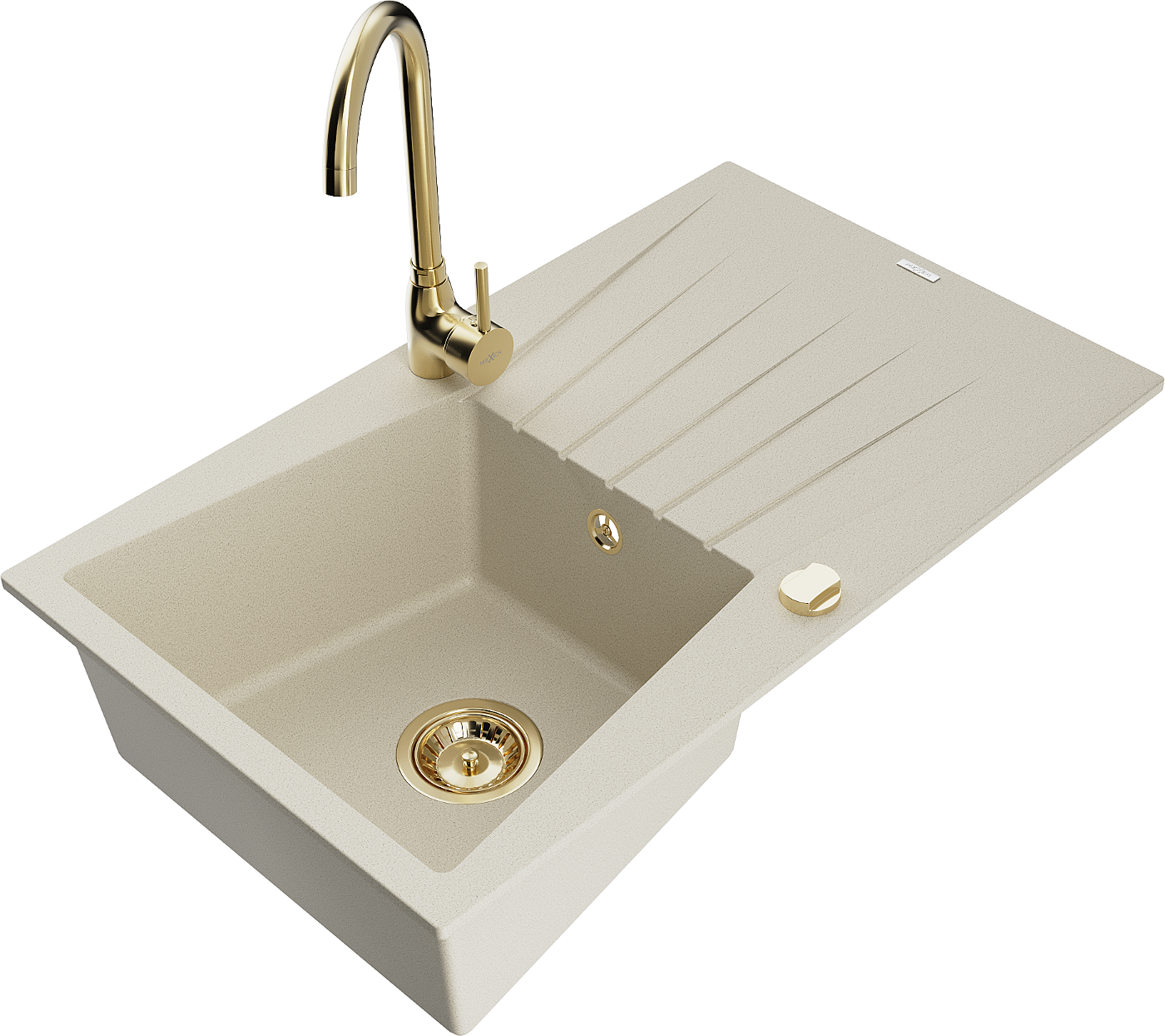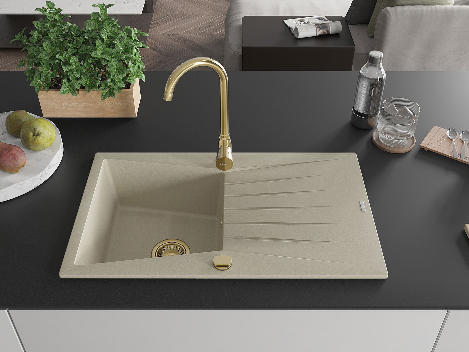 Mexen Cesar egykamrás gránit mosogatótálca lefolyóval és Telma konyhai csapteleppel, bézs - 6514-69-670200-50