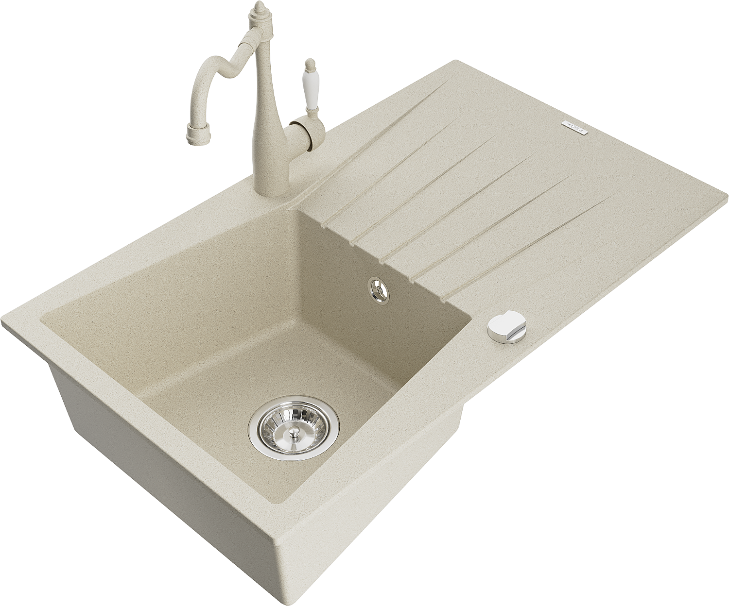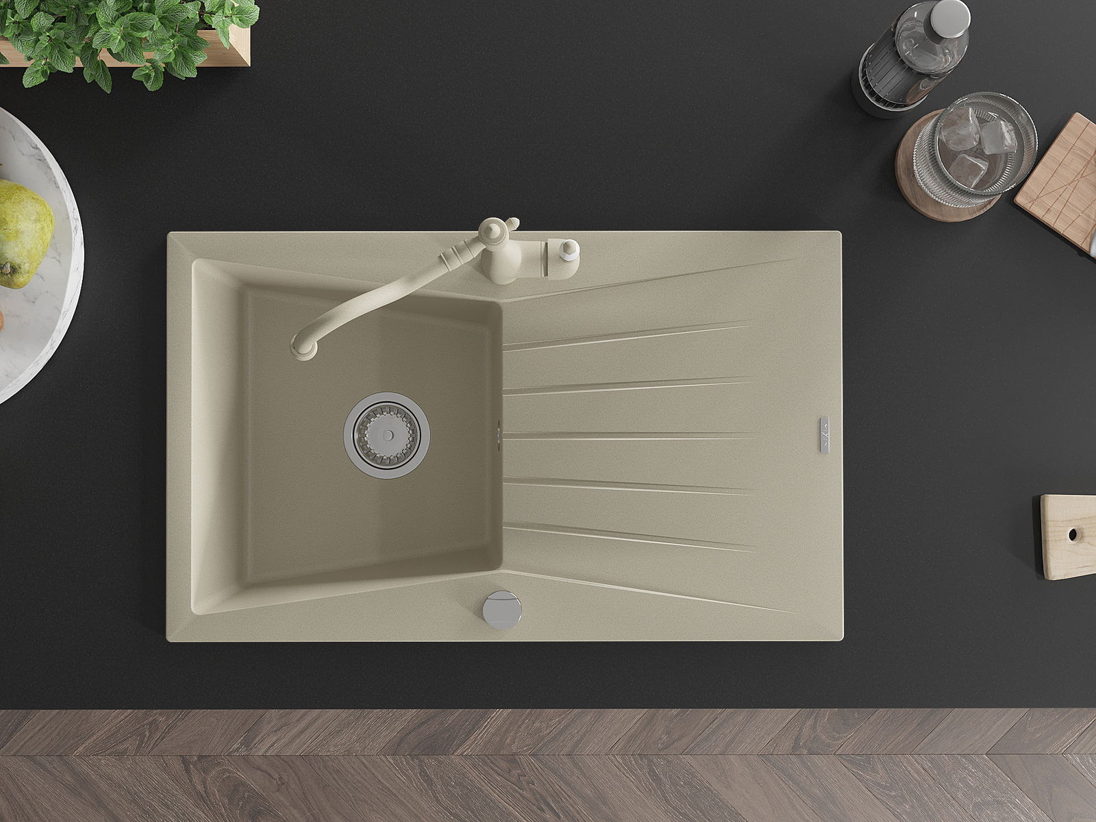 Mexen Cesar egymedencés gránit mosogató csepegtetővel és Carla konyhai csapteleppel, bézs - 6514-69-670700-69