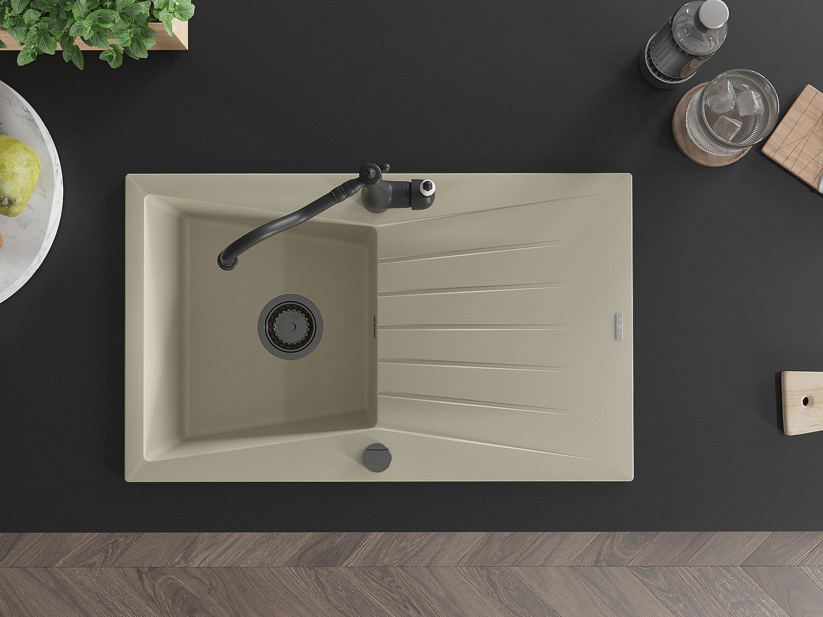 Mexen Cesar gránit 1-kamrás mosogató csepegtetővel és Carla konyhai csapteleppel, bézs - 6514-69-670700-70