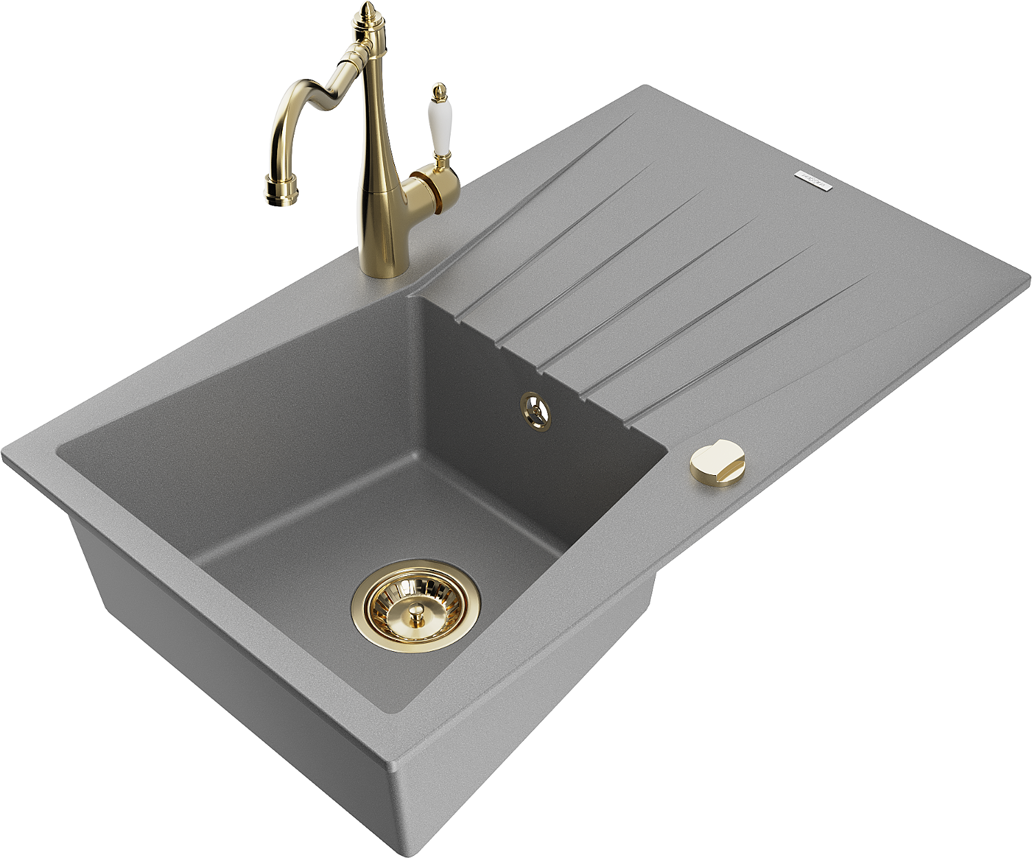 Mexen Cesar gránit egytálcás mosogató csepegtetővel és Carla konyhai csappal, szürke - 6514-71-670700-50
