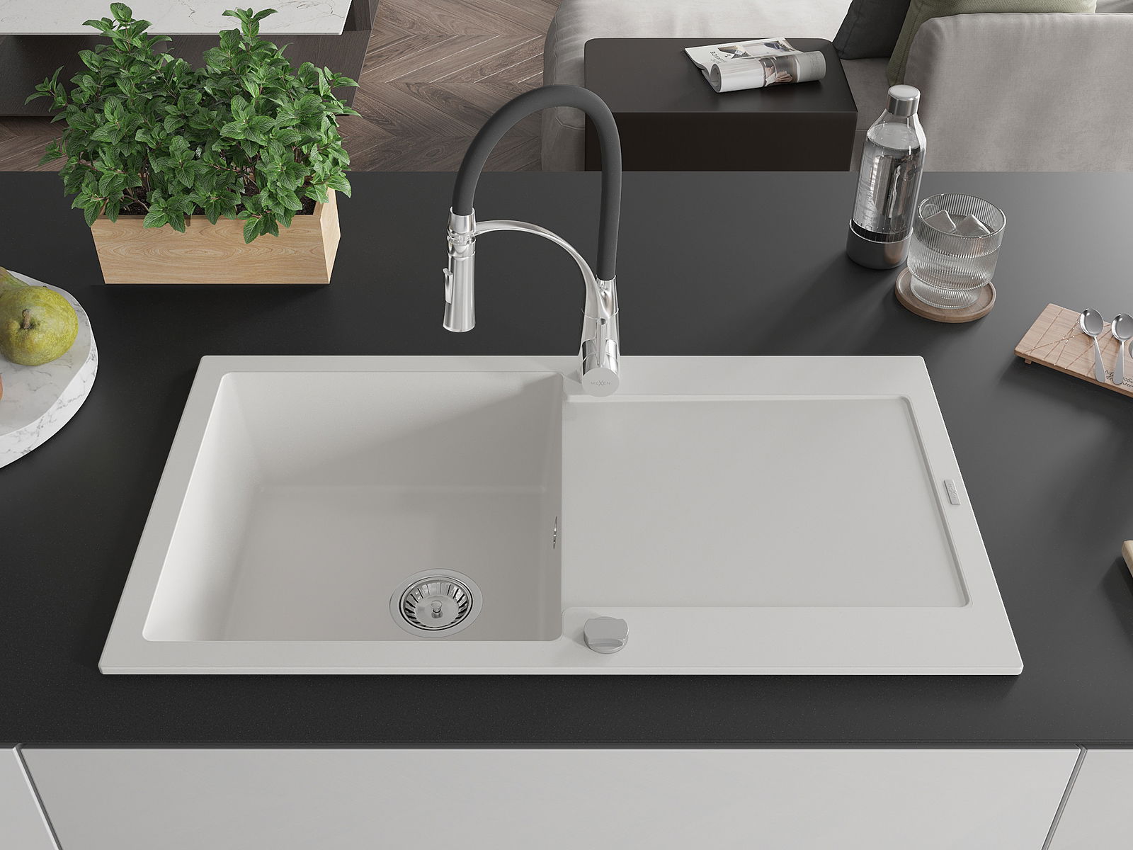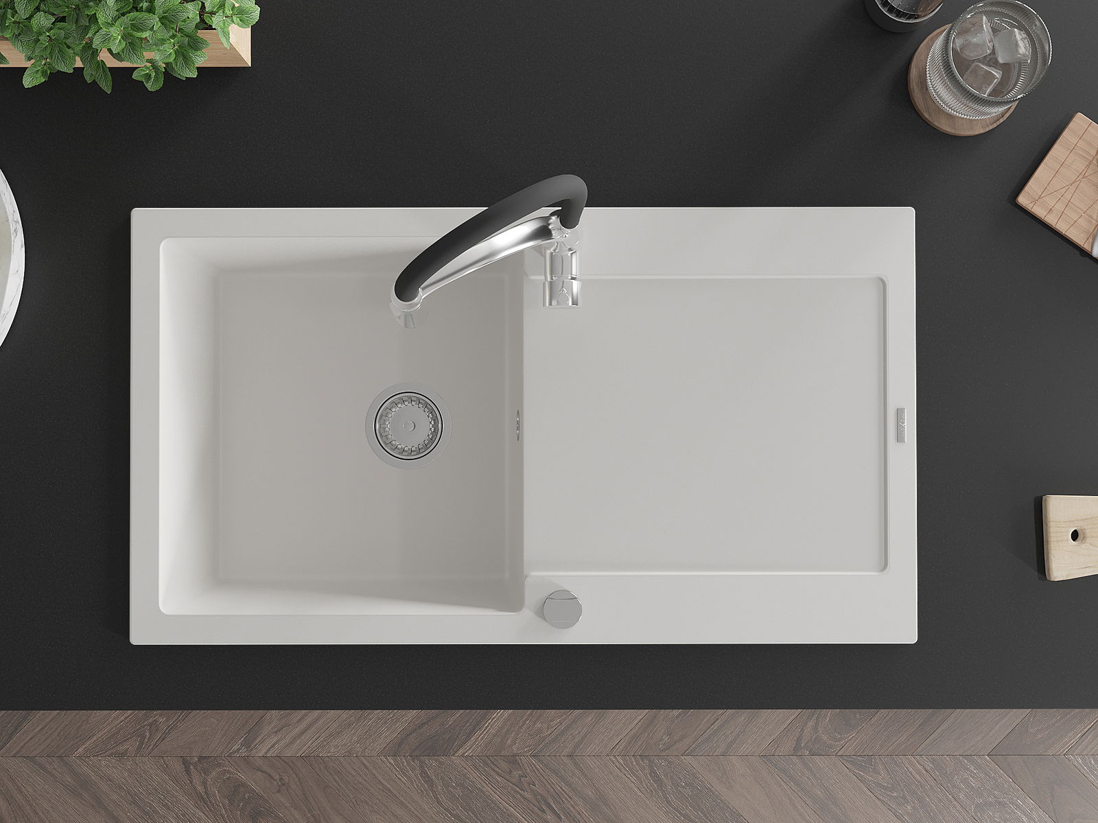 Mexen Leo egykamrás gránit mosogató csepegtetővel és Aster konyhai csapteleppel, fehér - 6501-20-73450-07