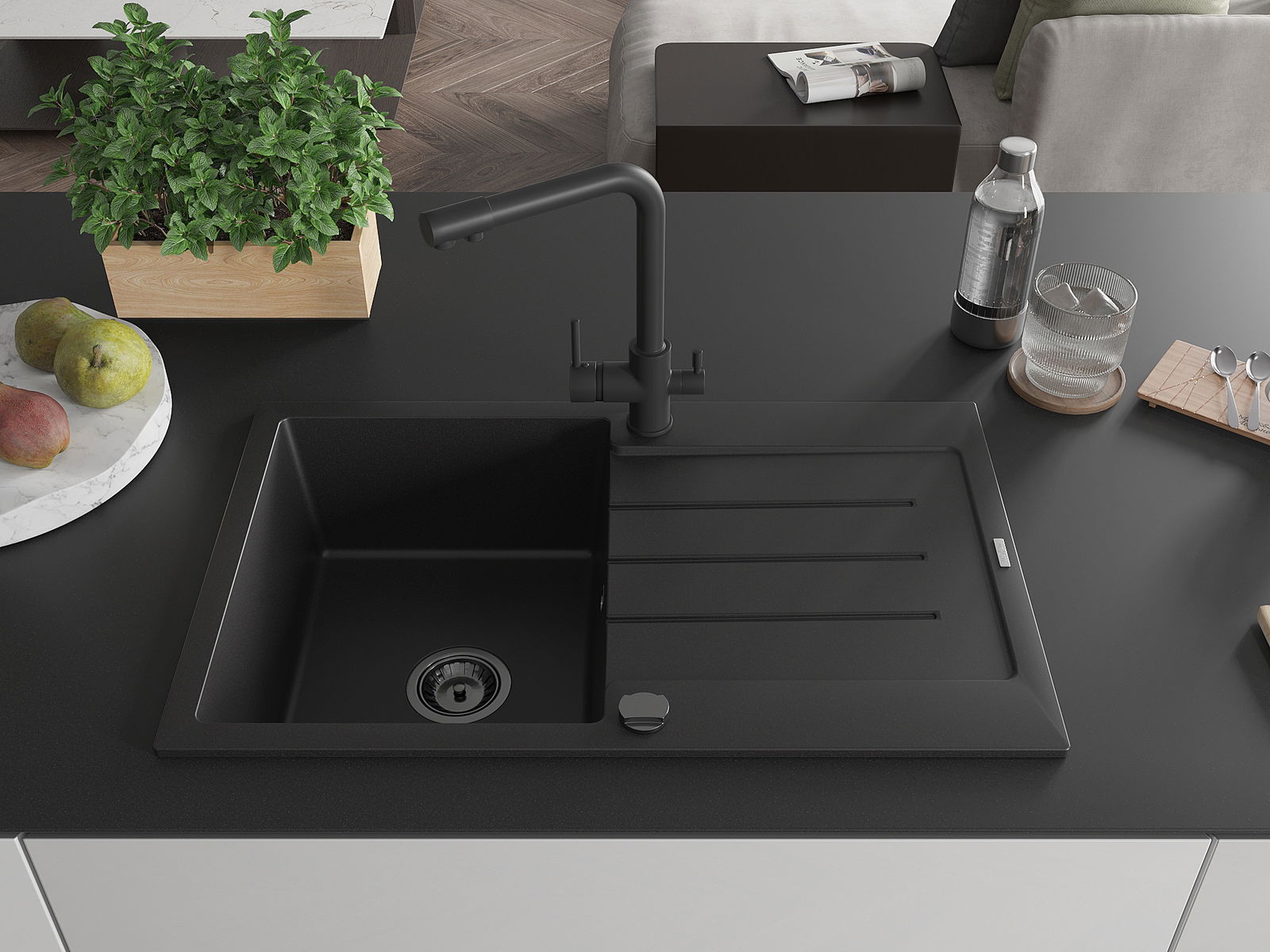 A mosogató magas minőségű gránitból készült. Elegáns, de mindenekelőtt praktikus kiegészítője minden konyhának, függetlenül annak stílusától. A gránit magas minősége és tartóssága hosszú távú használatot biztosít.