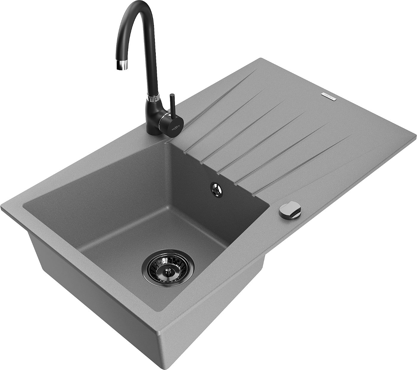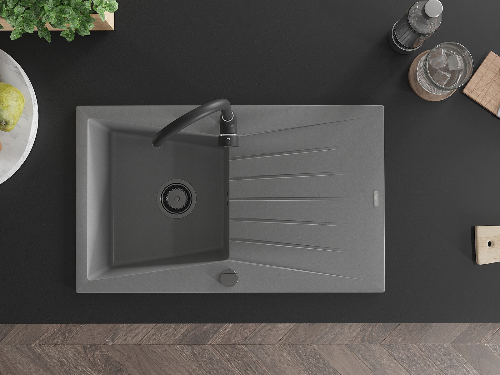 Mexen Cesar egymedencés gránit mosogató csepegtetőtálcával és Telma konyhai csapteleppel, szürke - 6514-71-670200-70-B