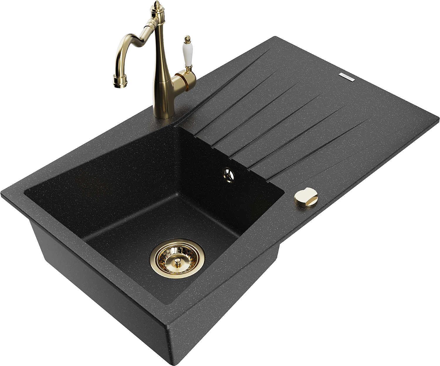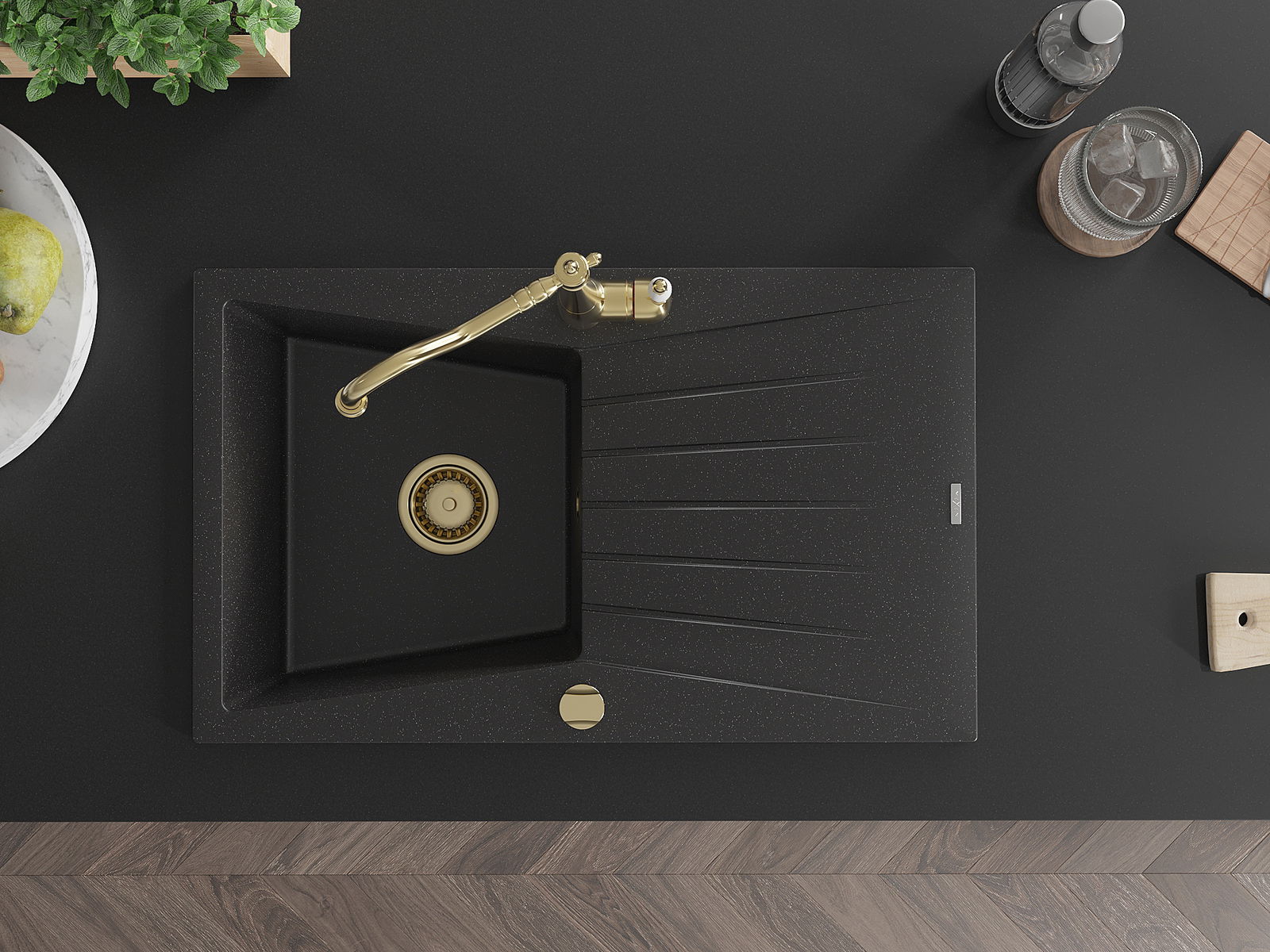 Mexen Cesar gránit mosogató 1-medencés csepegtetővel és Carla konyhai csapteleppel, fekete/ezüst metál - 6514-73-670700-50