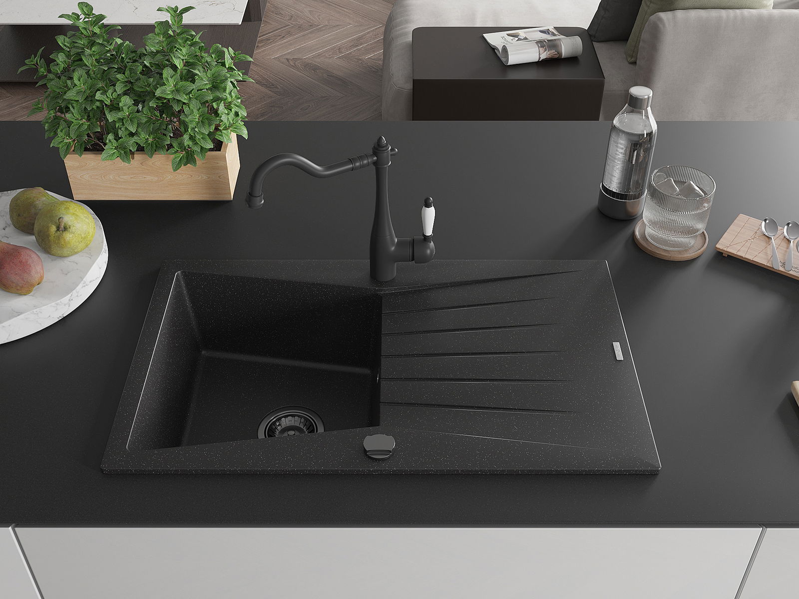 A mosogató kiváló minőségű gránitból készül. Ez egy elegáns és mindenekelőtt minden konyhához praktikus kiegészítés, stílusától függetlenül. A kiváló minőségű és a gránit tartósság biztosítja a sok éves használatát.