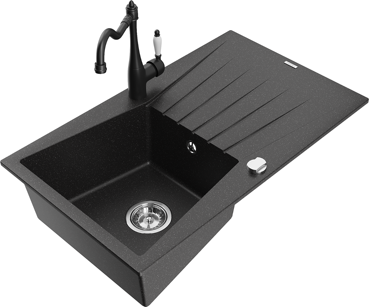 Mexen Cesar gránit mosogató 1-medencés csepegtetővel és Carla konyhai csapteleppel, fekete/ezüst metál - 6514-73-670700-70