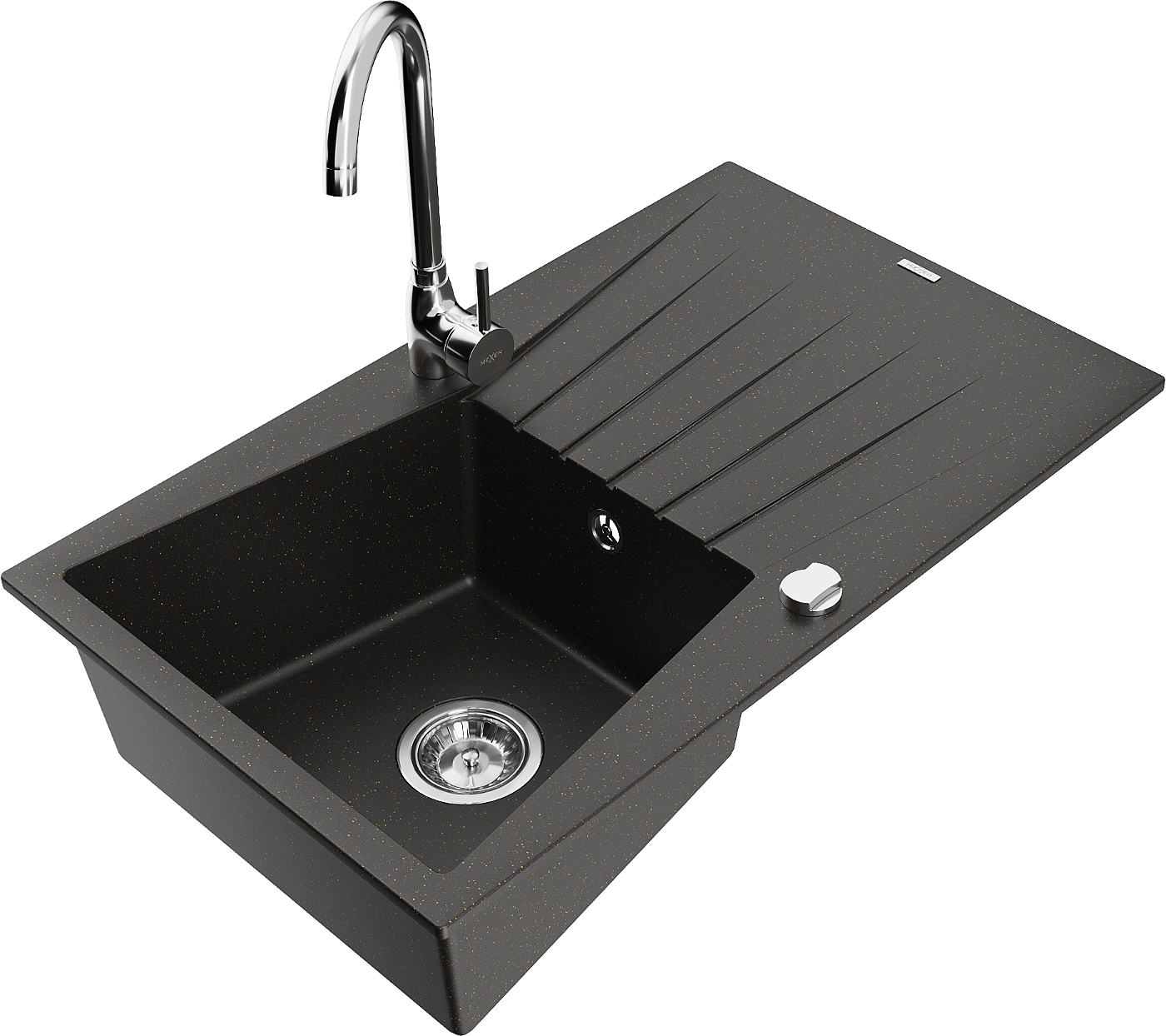 Mexen Cesar gránit mosogató 1-medencés csepegtetővel és Telma konyhai csappal, fekete/arany - 6514-75-670200-00