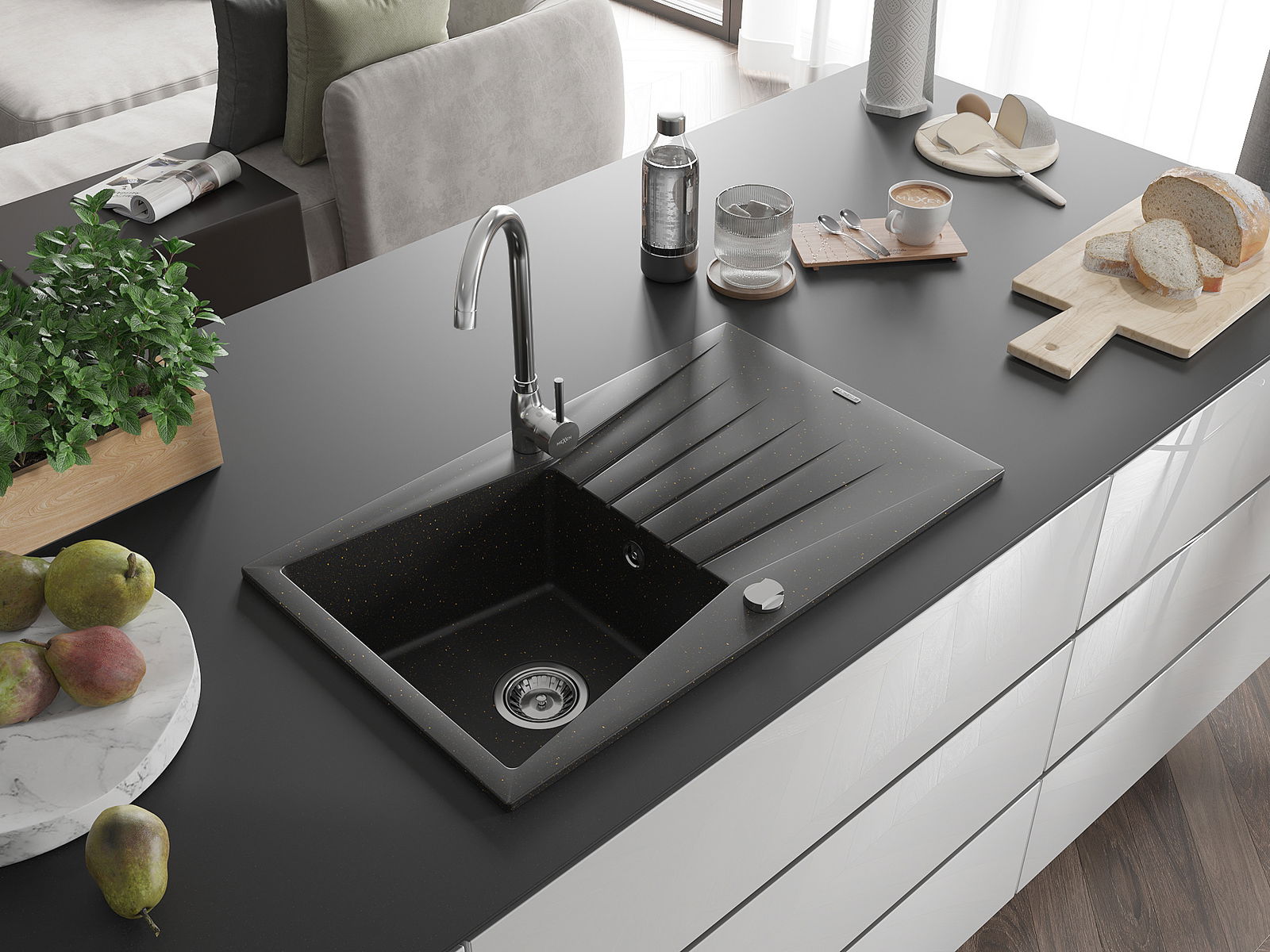 A mosogató kiváló minőségű gránitból készül. Ez egy elegáns és mindenekelőtt minden konyhához praktikus kiegészítés, stílusától függetlenül. A kiváló minőségű és a gránit tartósság biztosítja a sok éves használatát.