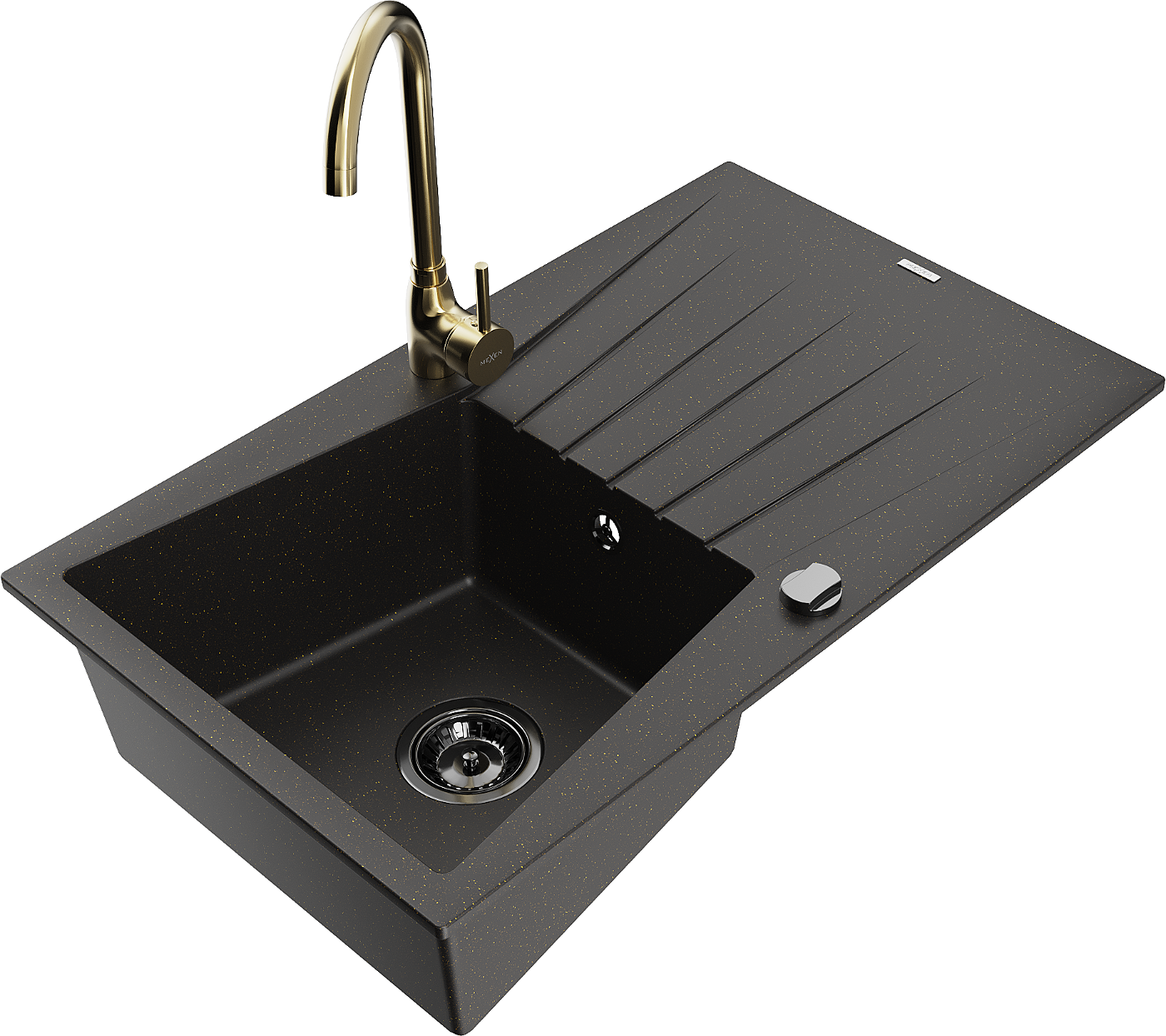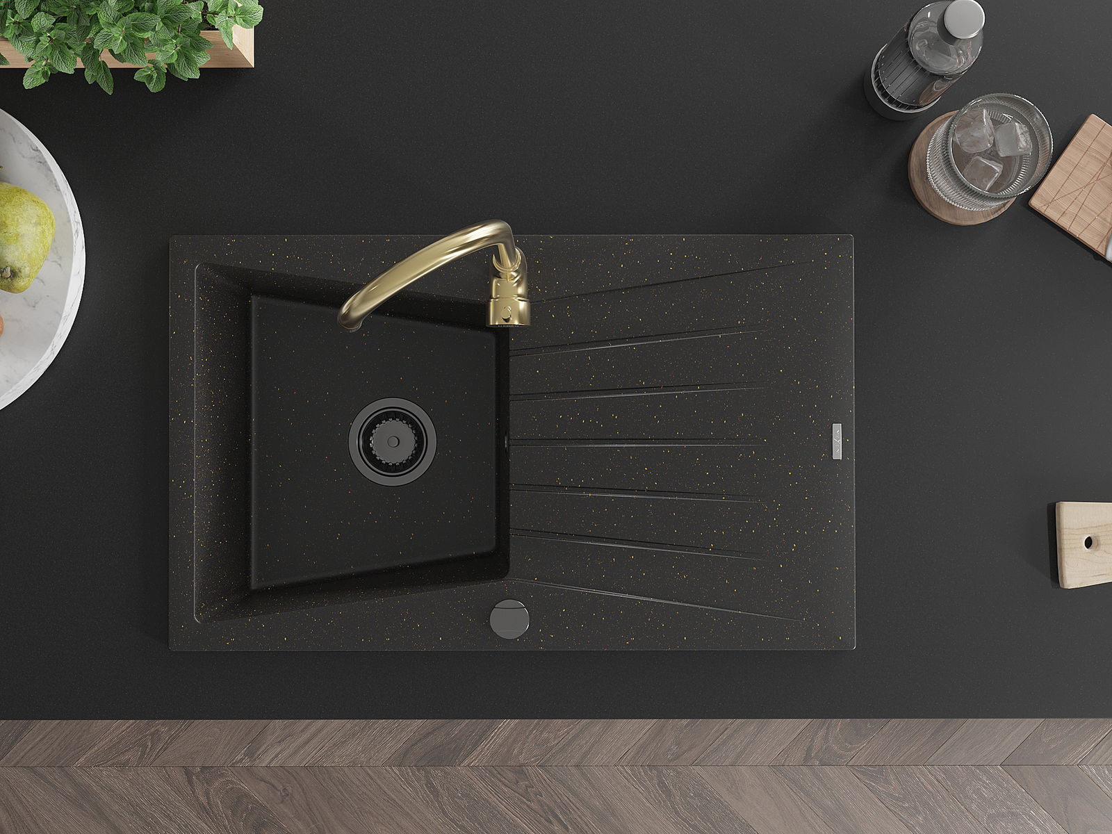 Mexen Cesar 1 rekeszes gránit mosogató csepegtetővel és Telma konyhai csapteleppel, fekete/arany - 6514-75-670200-50-B