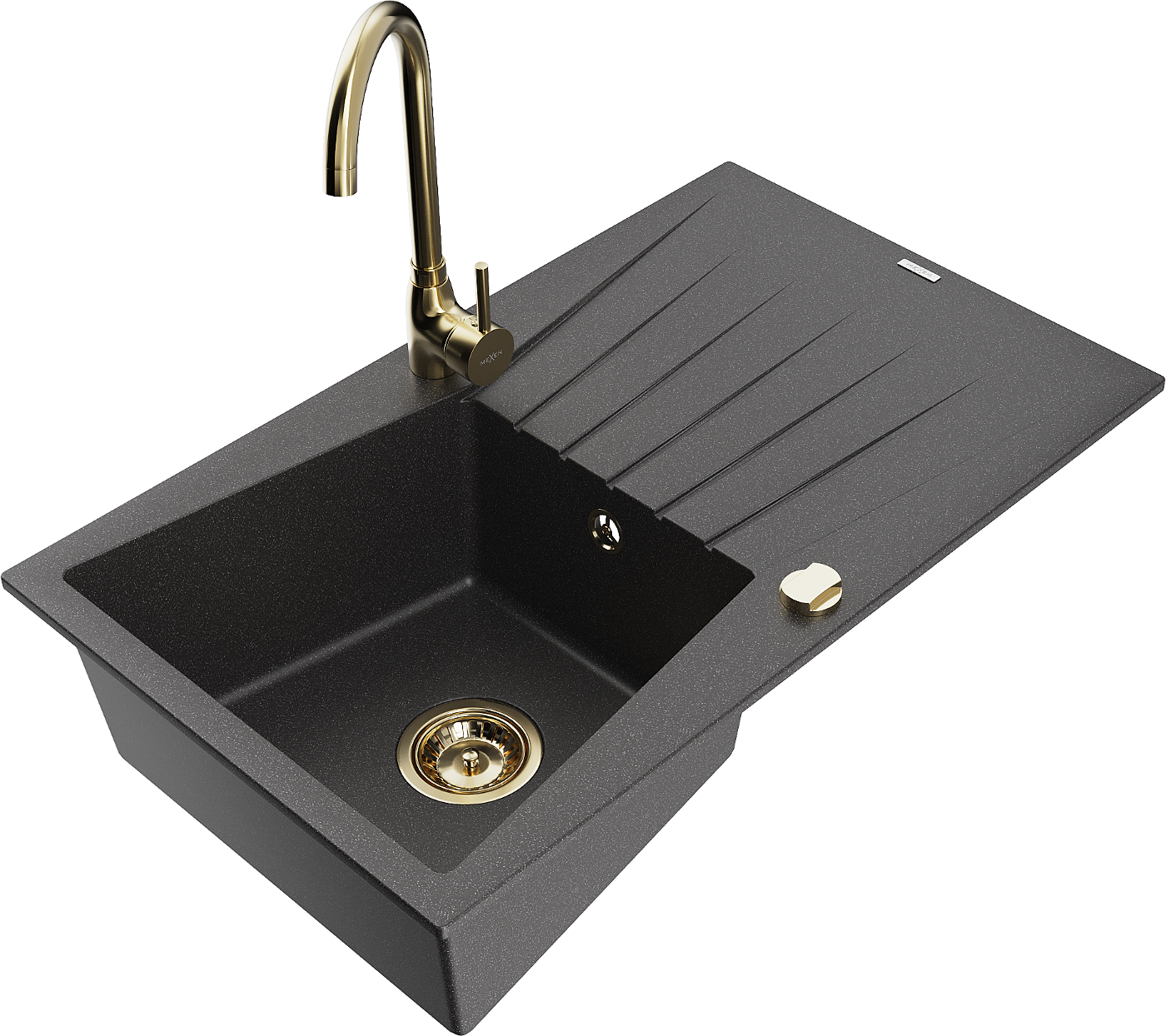 Mexen Cesar gránit mosogató 1 medencés csepegtetővel és Telma konyhai csapteleppel, fekete pöttyös - 6514-76-670200-50