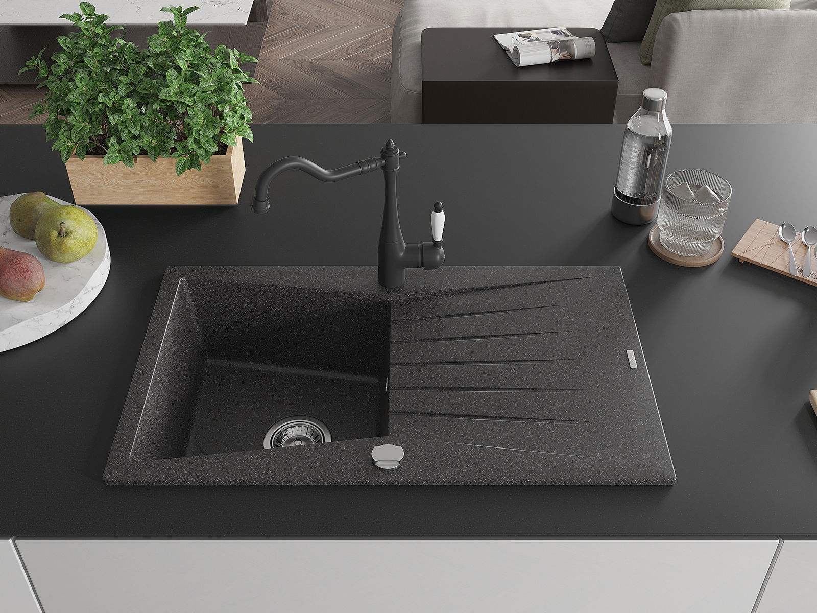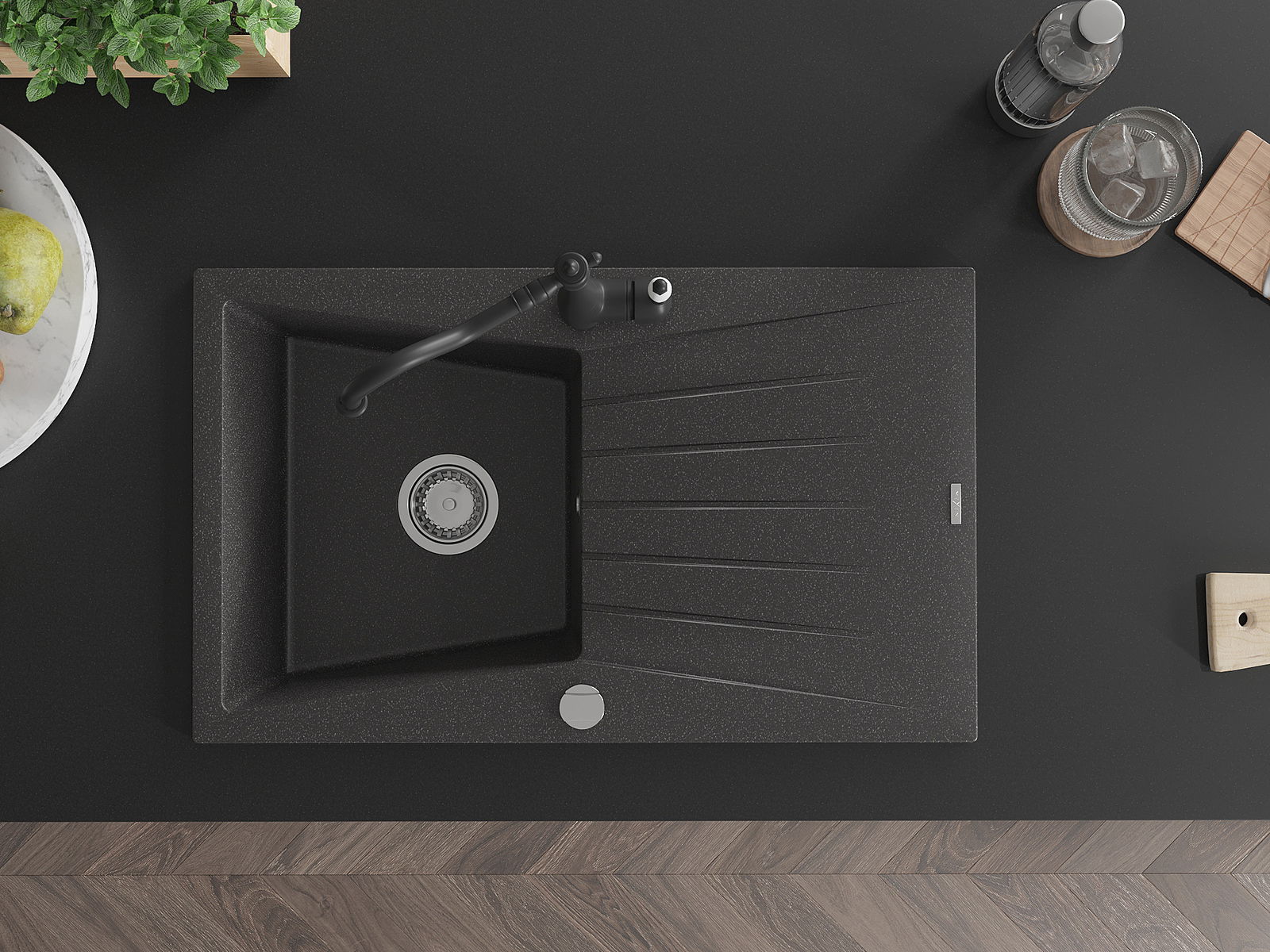 A mosogató magas minőségű gránitból készült. Elegáns, de mindenekelőtt praktikus kiegészítője minden konyhának, függetlenül annak stílusától. A gránit magas minősége és tartóssága hosszú távú használatot biztosít.