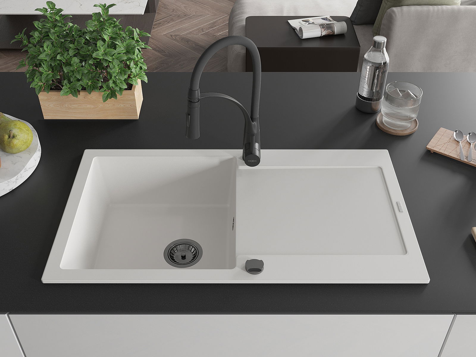 Mexen Leo 1-medencés gránit mosogató csepegtetővel és Aster konyhai csappal, fehér - 6501-20-73450-70-B
