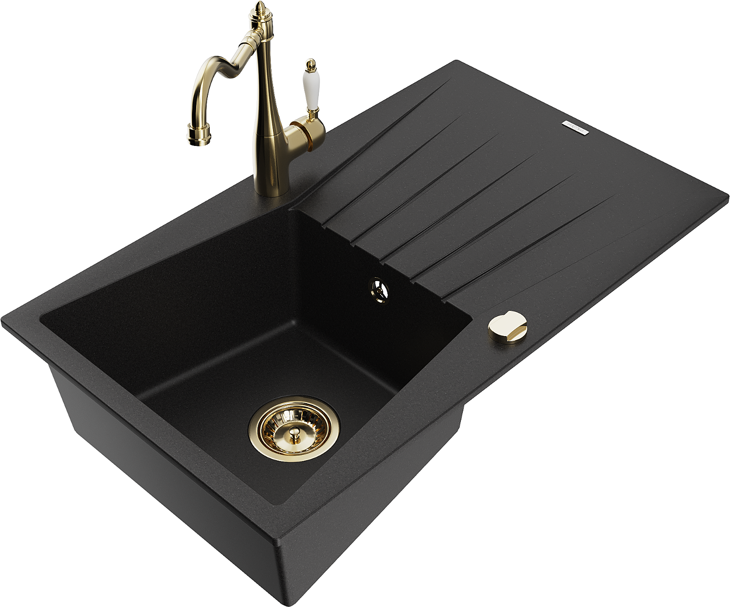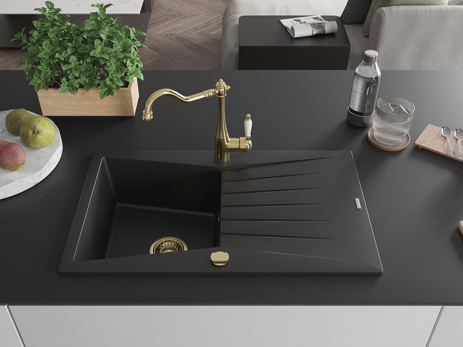 Mexen Cesar 1 rekeszes gránit mosogató csepegtetővel és Carla konyhai csapteleppel, fekete - 6514-77-670700-50