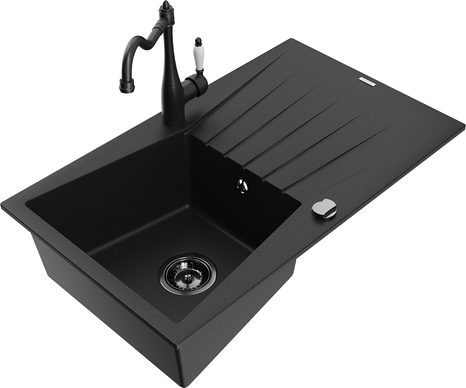 Mexen Cesar 1-medencés gránit mosogató csepegtetővel és Carla konyhai csapteleppel, fekete - 6514-77-670700-70-B
