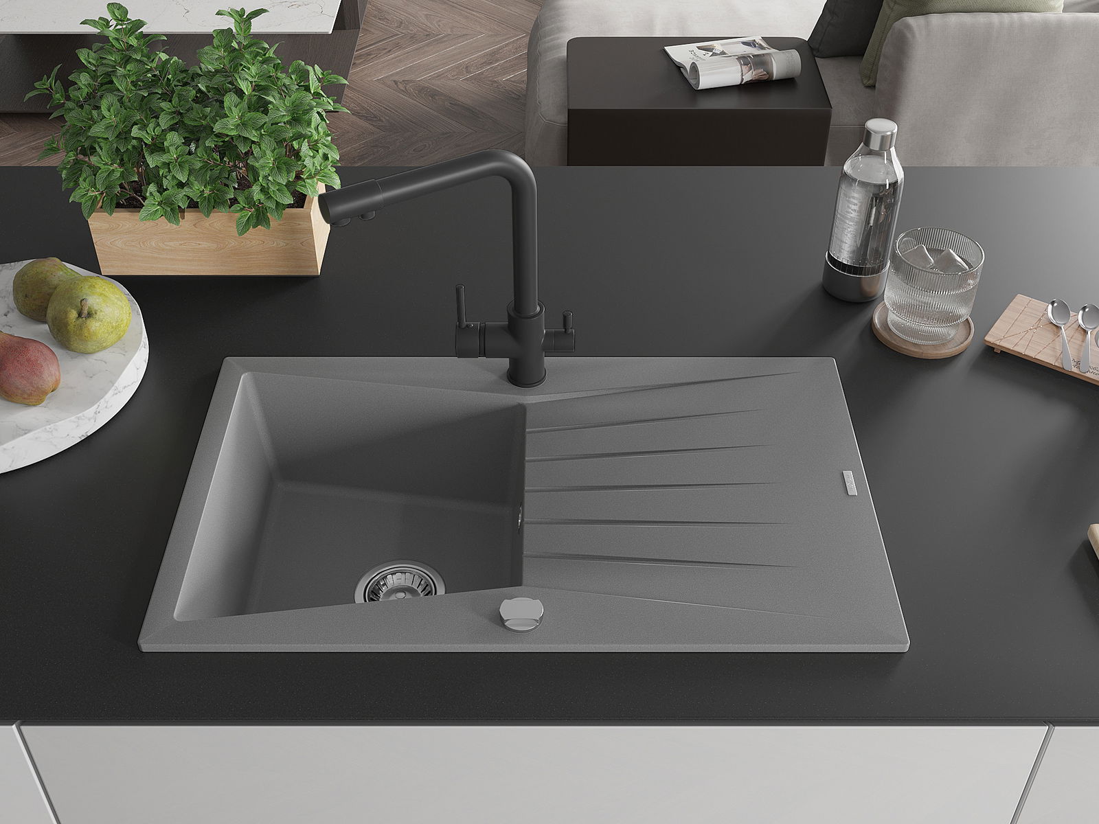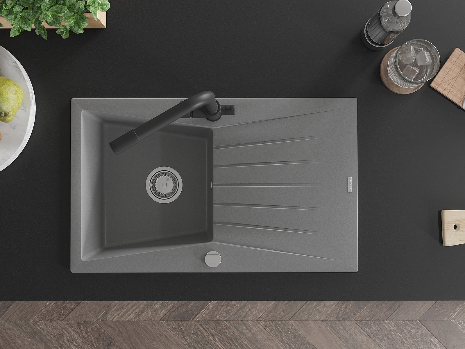 A mosogató magas minőségű gránitból készült. Elegáns, de mindenekelőtt praktikus kiegészítője minden konyhának, függetlenül annak stílusától. A gránit magas minősége és tartóssága hosszú távú használatot biztosít.