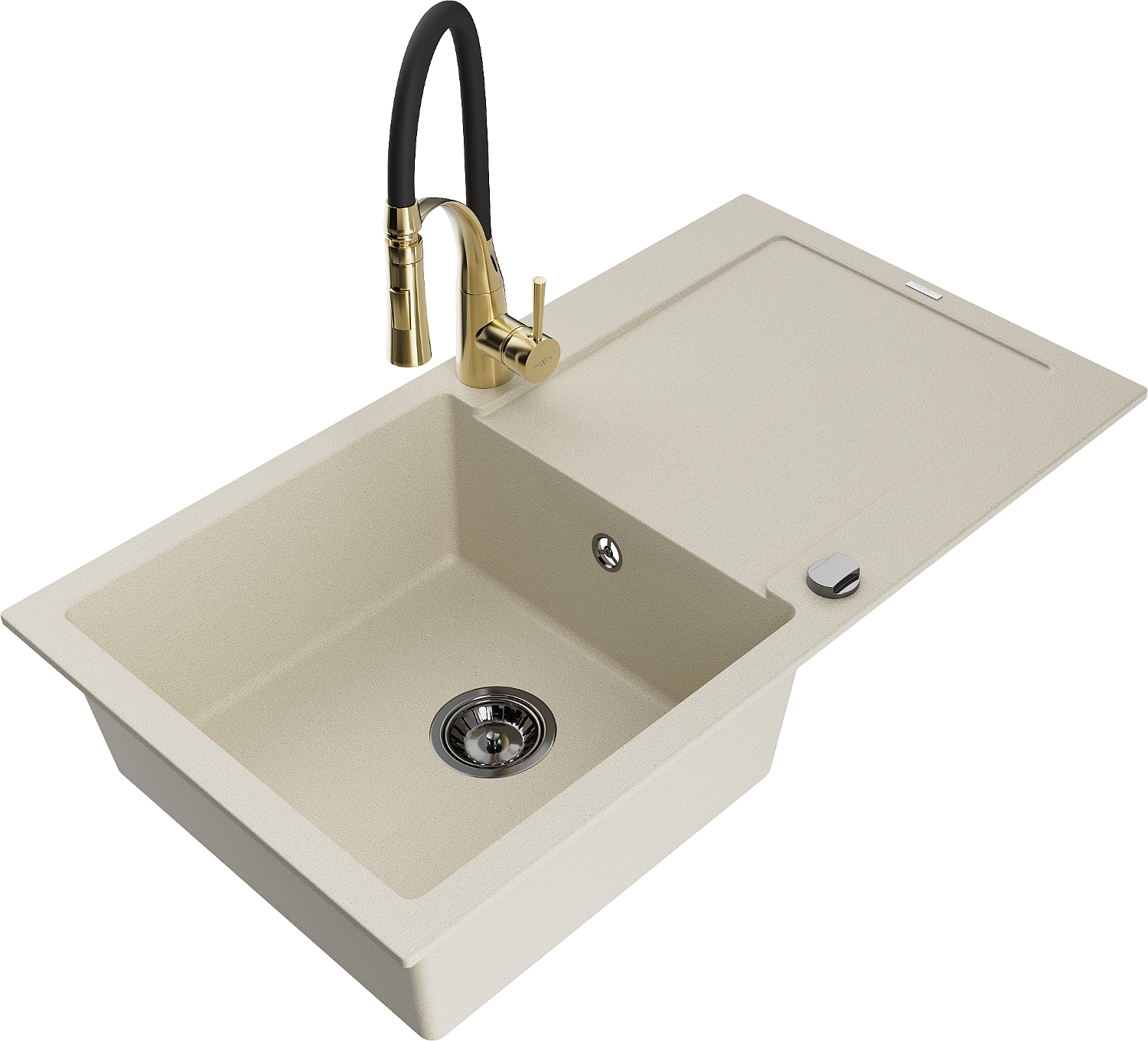 Mexen Leo egykamrás gránit mosogató csepegtetővel és Aster konyhai csappal, bézs - 6501-69-73450-57-B