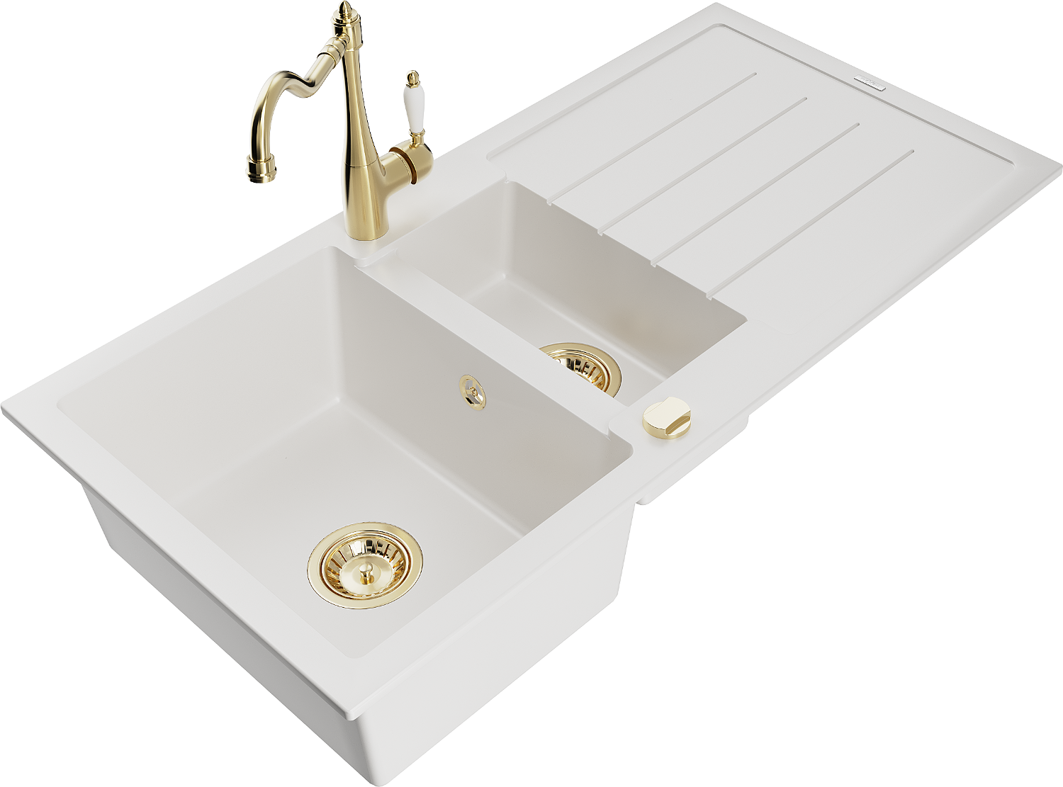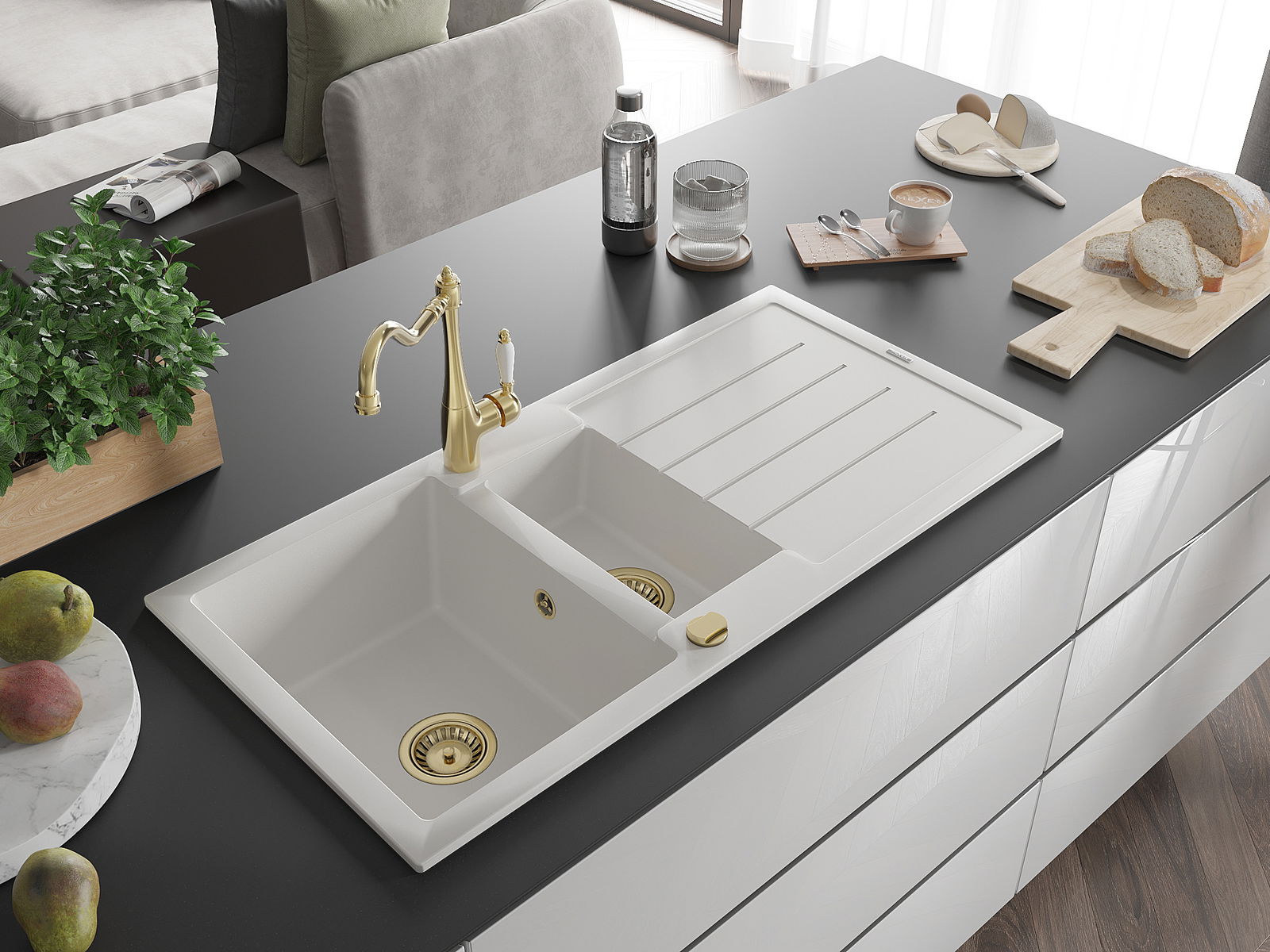 Mexen Andres 1,5 medencés gránit mosogató csepegtetővel és Carla konyhai csapteleppel, fehér - 6515-20-670700-50