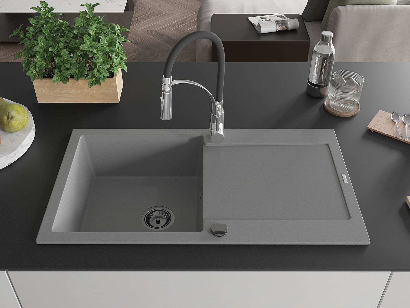 A mosogató kiváló minőségű gránitból készül. Ez egy elegáns és mindenekelőtt minden konyhához praktikus kiegészítés, stílusától függetlenül. A kiváló minőségű és a gránit tartósság biztosítja a sok éves használatát.