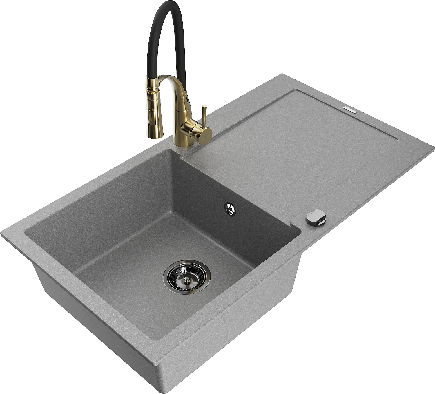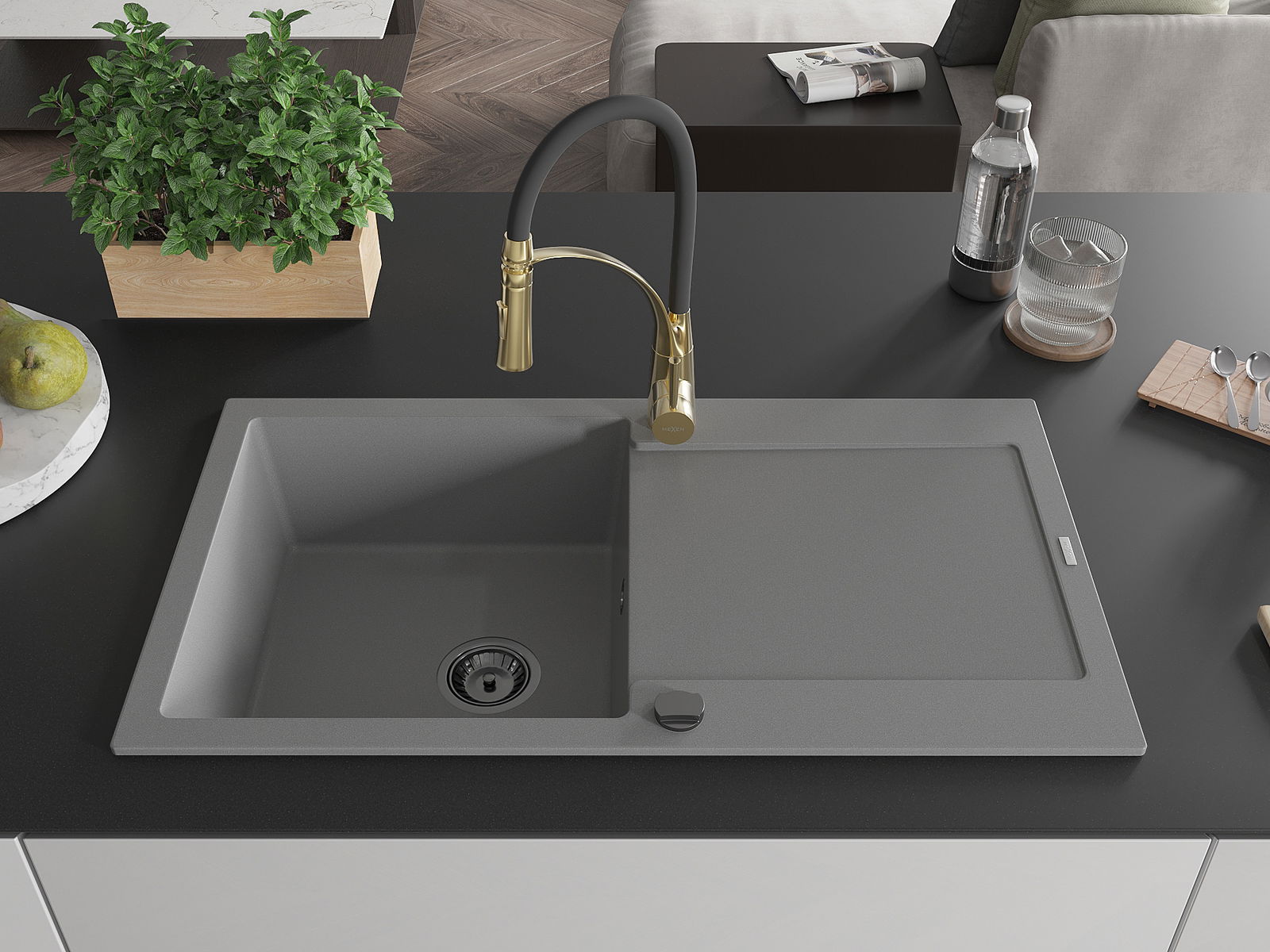 Mexen Leo egymedencés gránit mosogató csepegtetővel és Aster konyhai csappal, szürke - 6501-71-73450-57-B