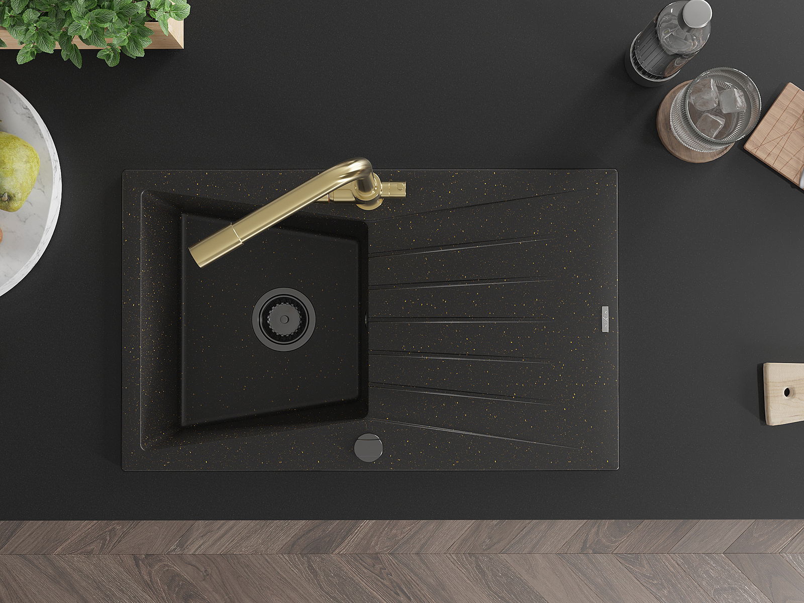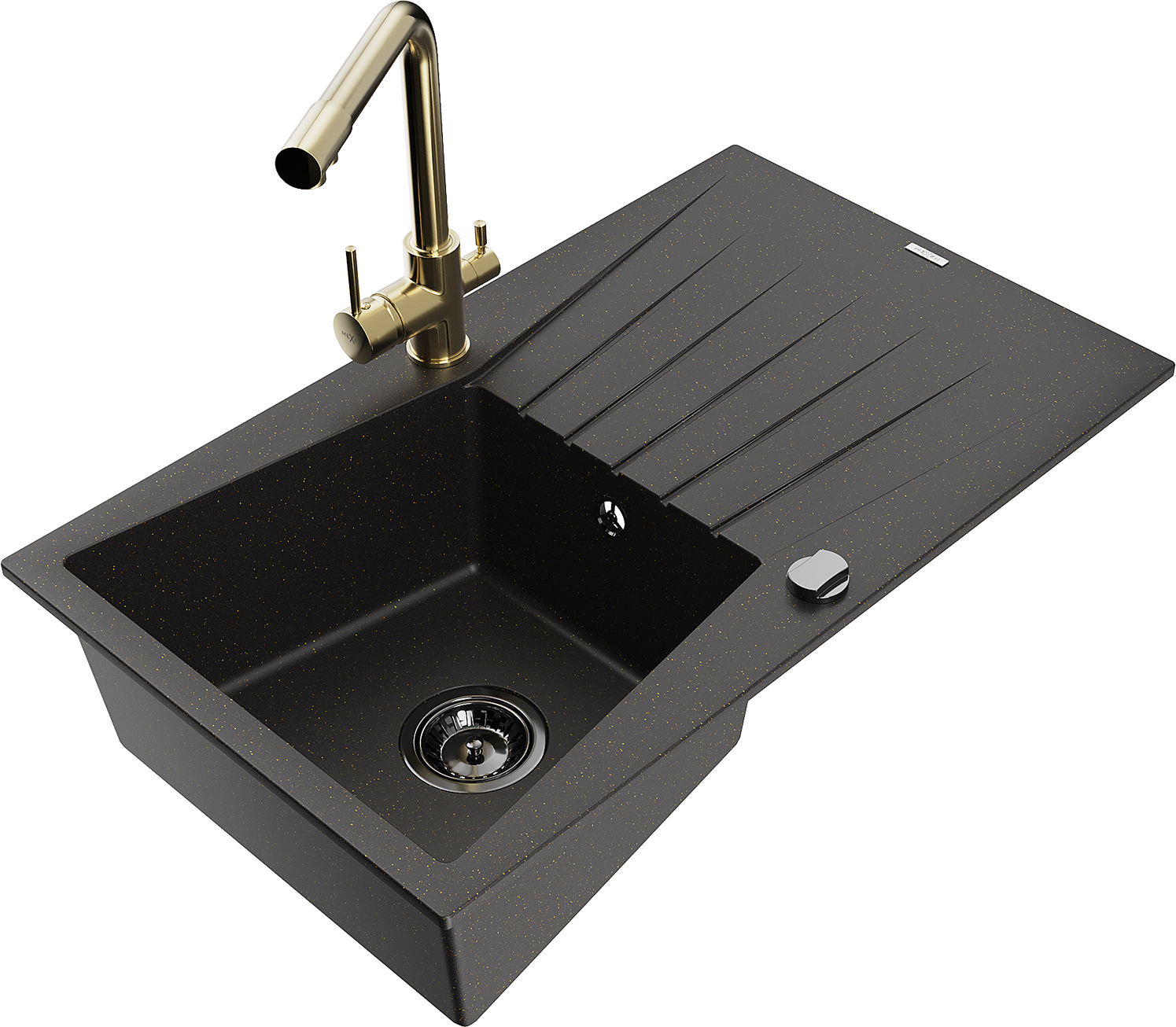 Mexen Cesar 1 rekeszes gránit mosogató csepegtetővel és Duero konyhai csapteleppel, fekete/arany metál - 6514-75-671600-50-B