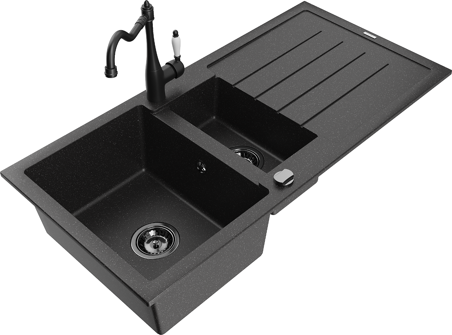 Mexen Andres gránit mosogató 1,5 kamrával, csepptálcával és Carla konyhai csapteleppel, fekete/ezüst - 6515-73-670700-70-B
