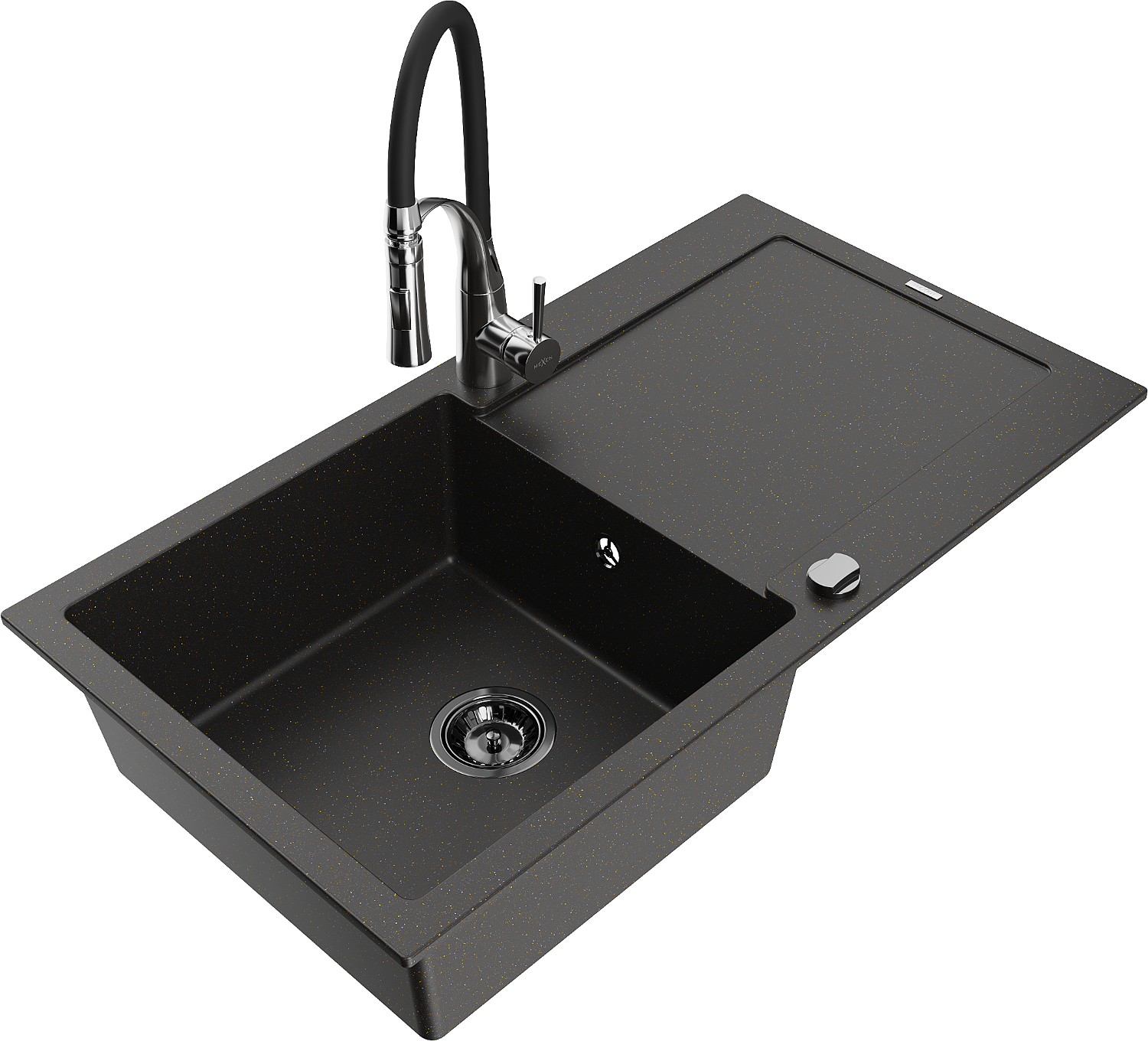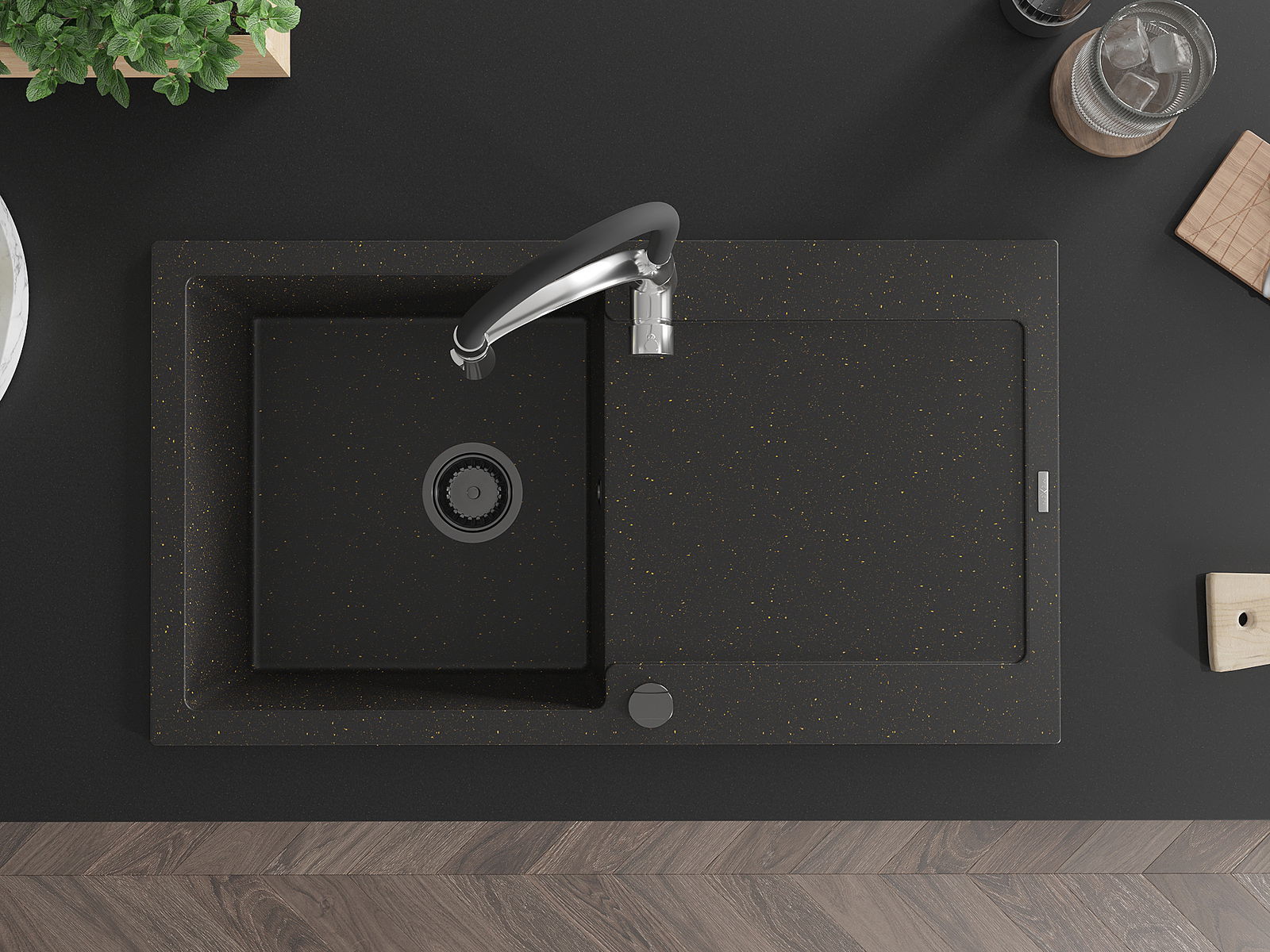 Mexen Leo gránit mosogató 1-medencés csepptálcával és Aster konyhai csapteleppel, fekete/arany metál - 6501-75-73450-07-B