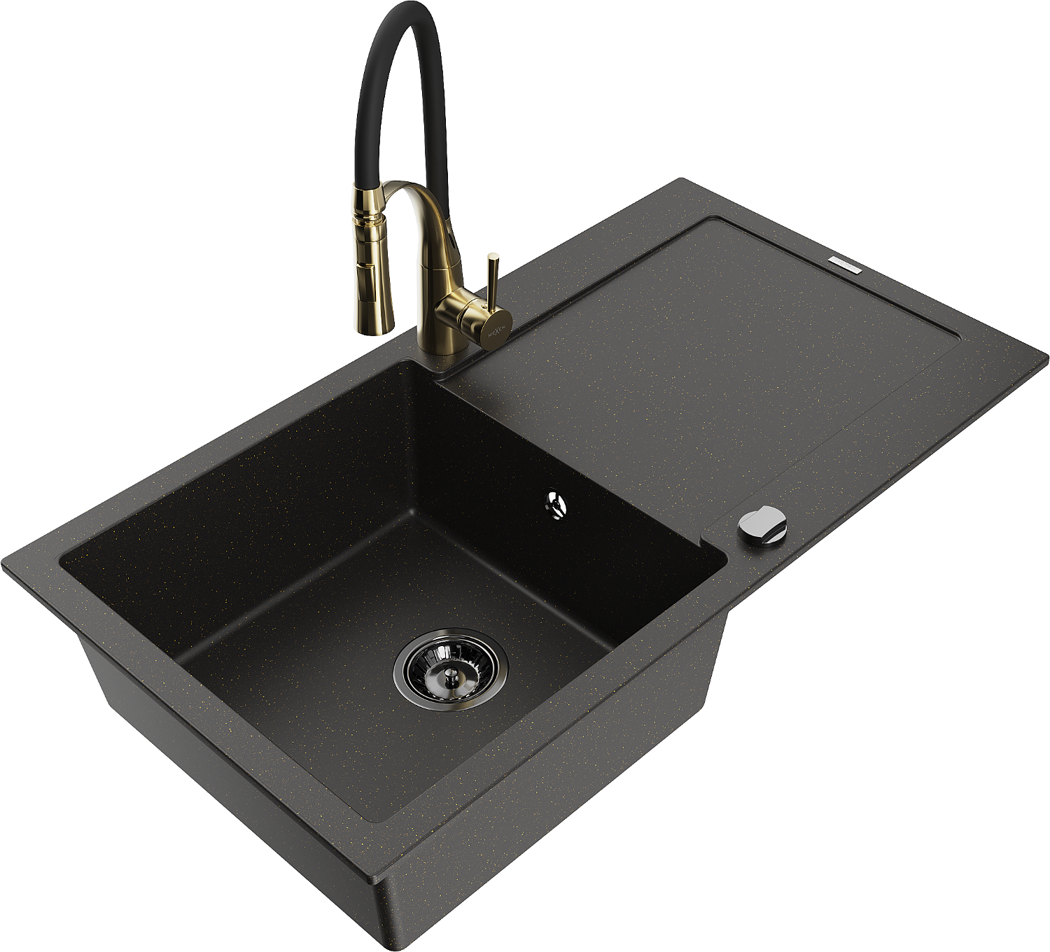 Mexen Leo egymedencés gránit mosogató csepptálcával és Aster konyhai csapteleppel, fekete/arany metál - 6501-75-73450-57-B