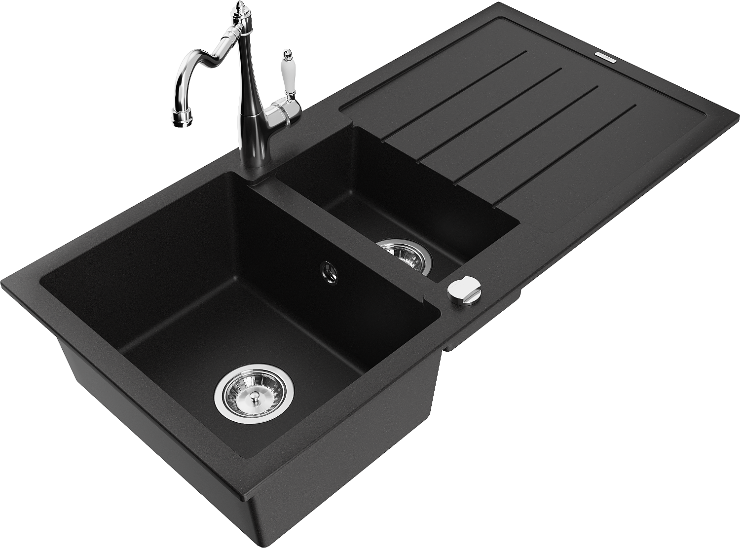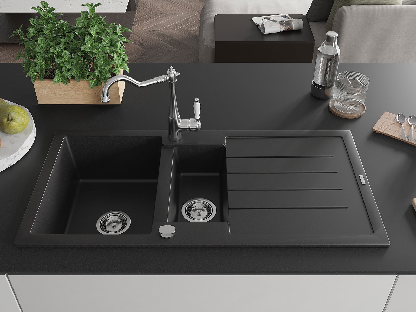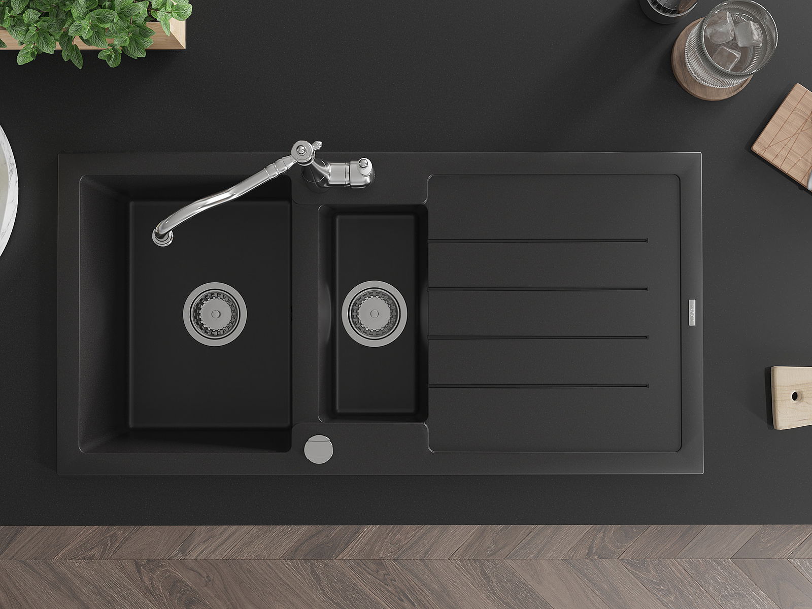 Mexen Andres gránit mosogató 1,5 medencés csepegtetővel és Carla konyhai csapteleppel, fekete - 6515-77-670700-00