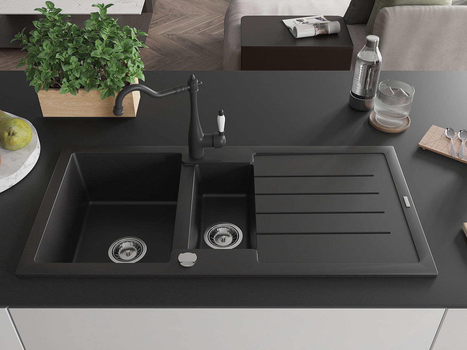 Mexen Andres gránit mosogató 1,5-medencés csepegtetővel és Carla konyhai csapteleppel, fekete - 6515-77-670700-70