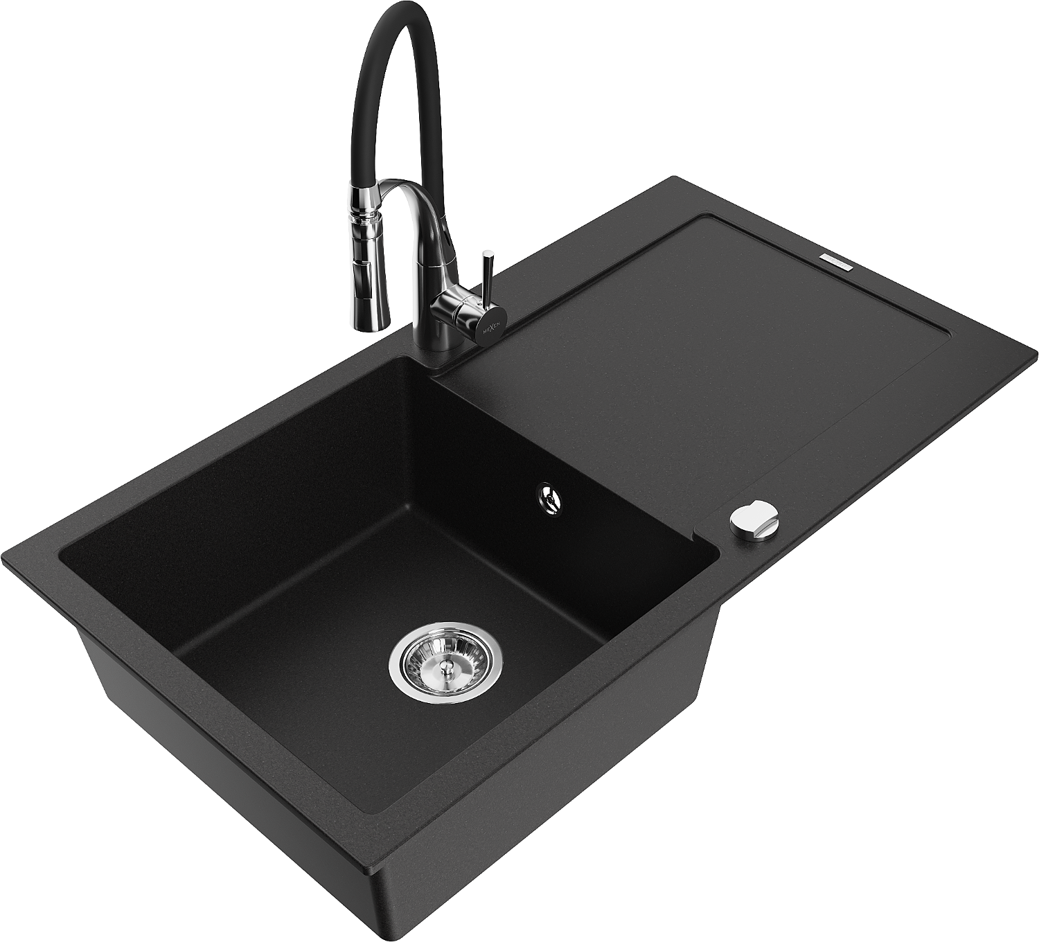 Mexen Leo egymedencés gránit mosogató csepegtetővel és Aster konyhai csapteleppel, fekete - 6501-77-73450-07