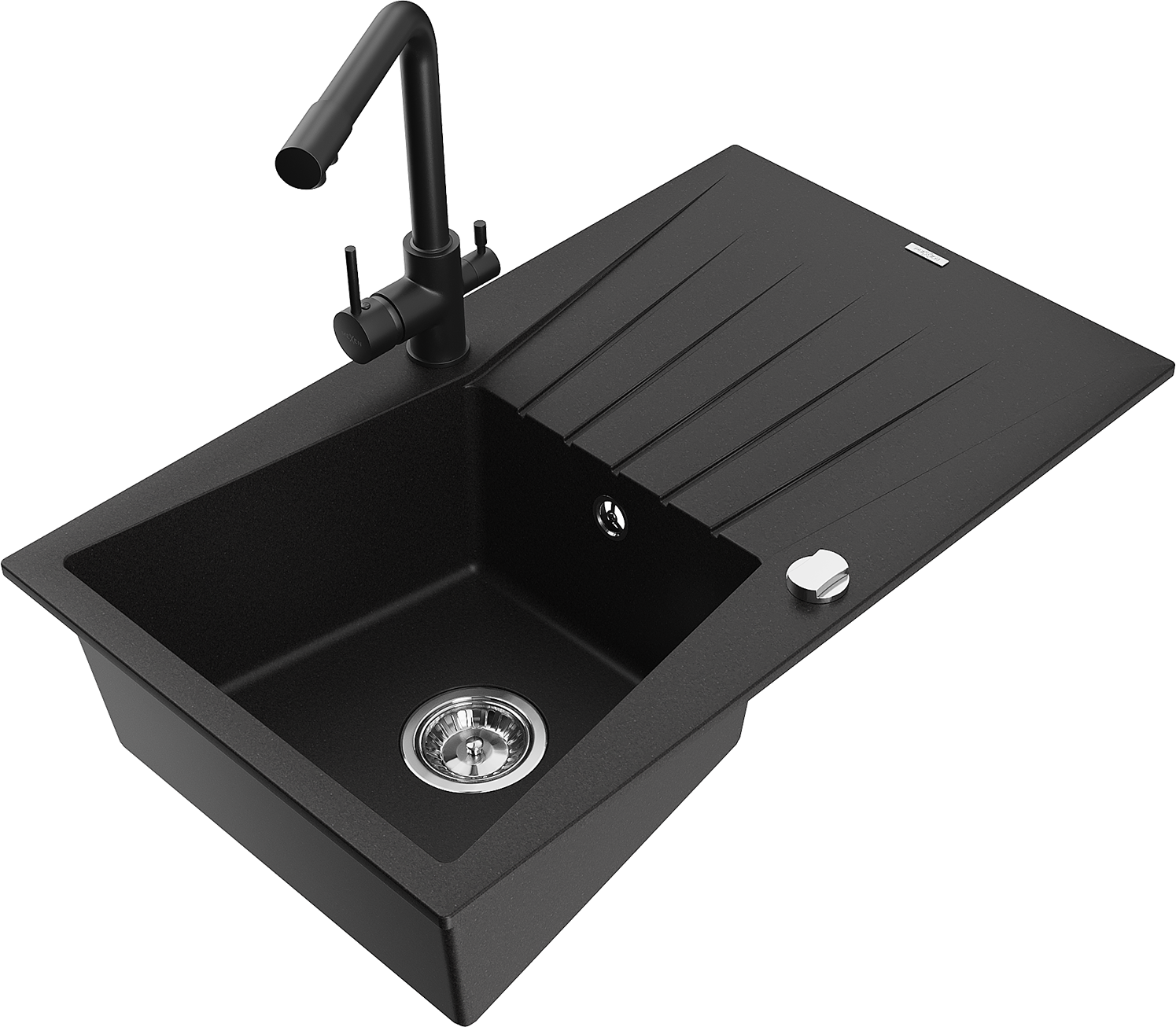 Mexen Cesar egykamrás gránit mosogató csepegtetővel és Duero konyhai csapteleppel, fekete - 6514-77-671600-70