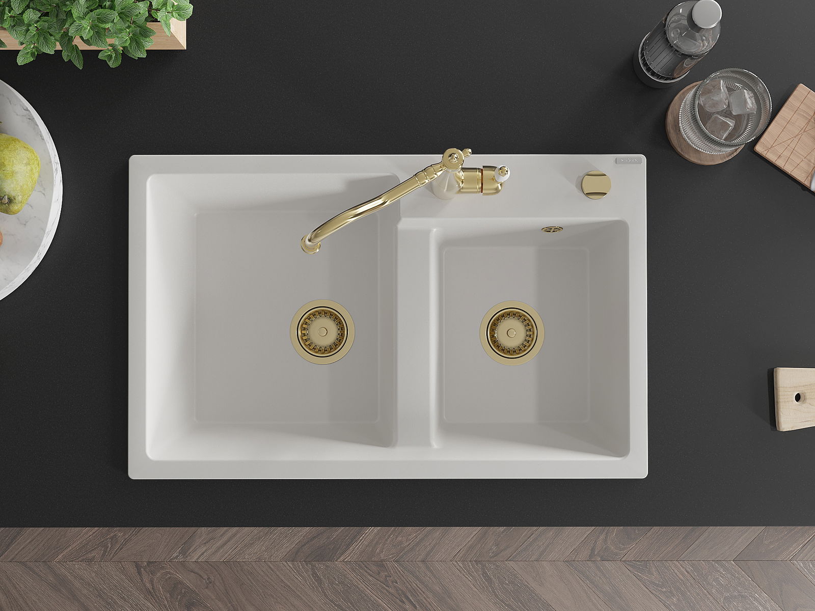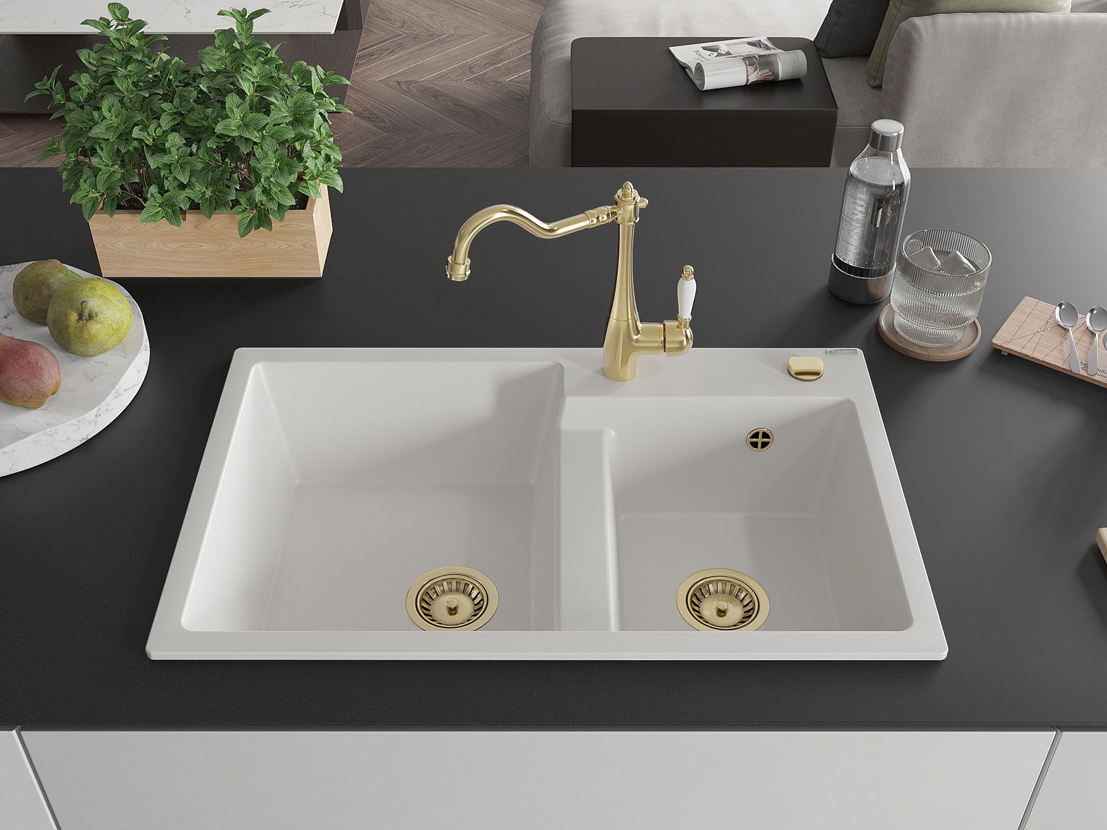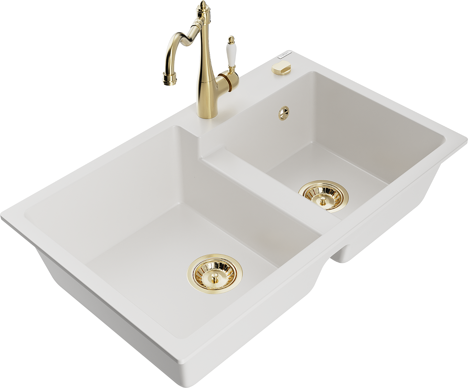 Mexen Tomas gránit konyhai mosogató 2 medencés Carla konyhai csapteleppel, fehér - 6516-20-670700-50