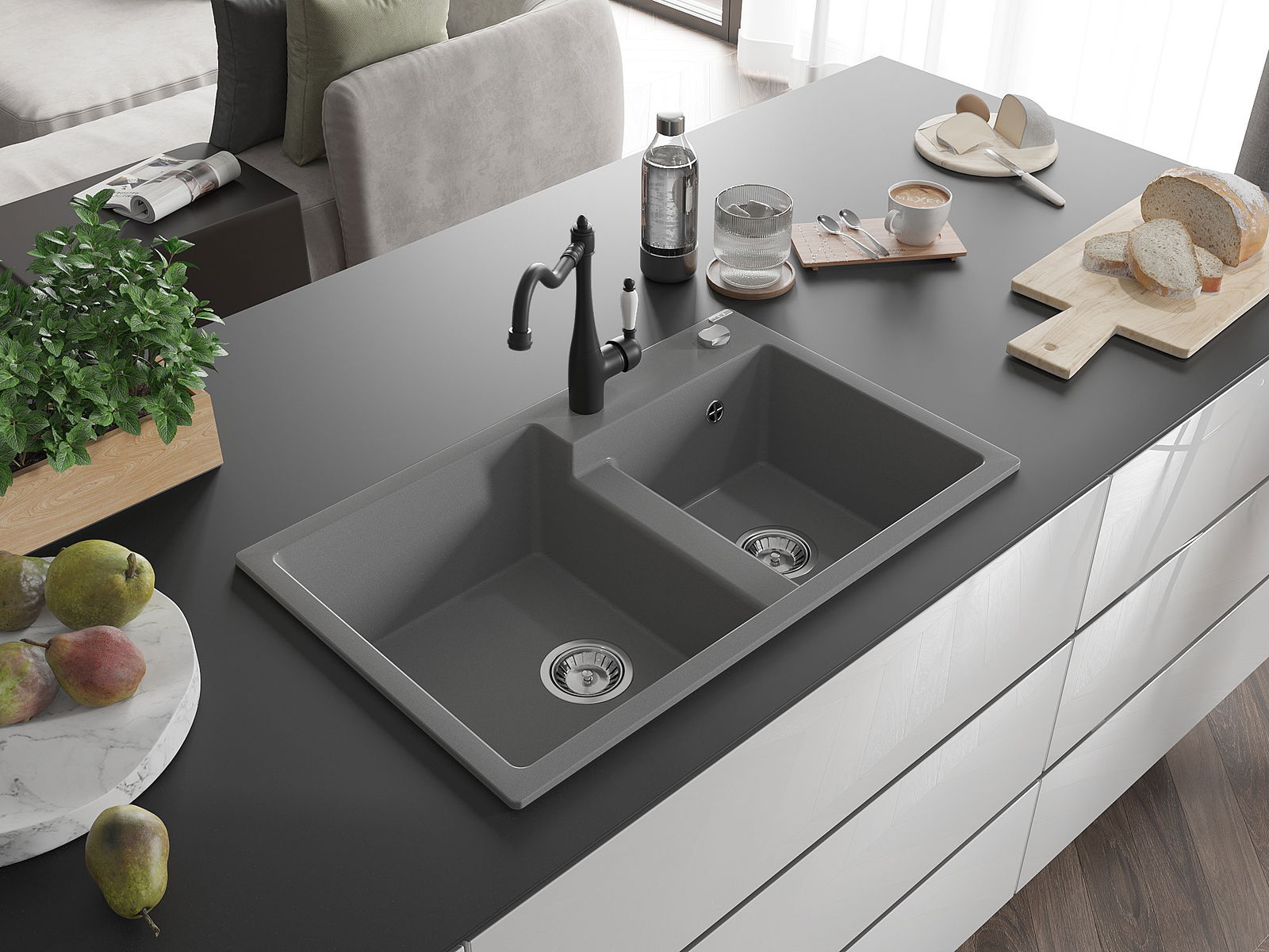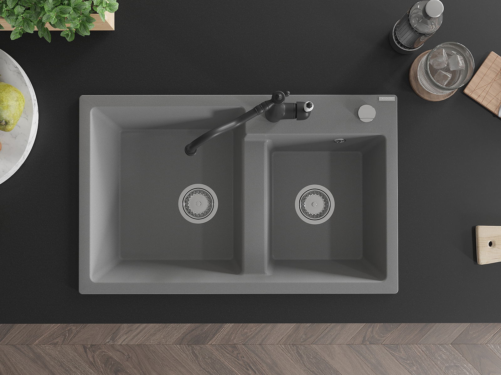 Mexen Tomas 2 rekeszes gránit mosogató Carla konyhai csapteleppel, szürke - 6516-71-670700-70