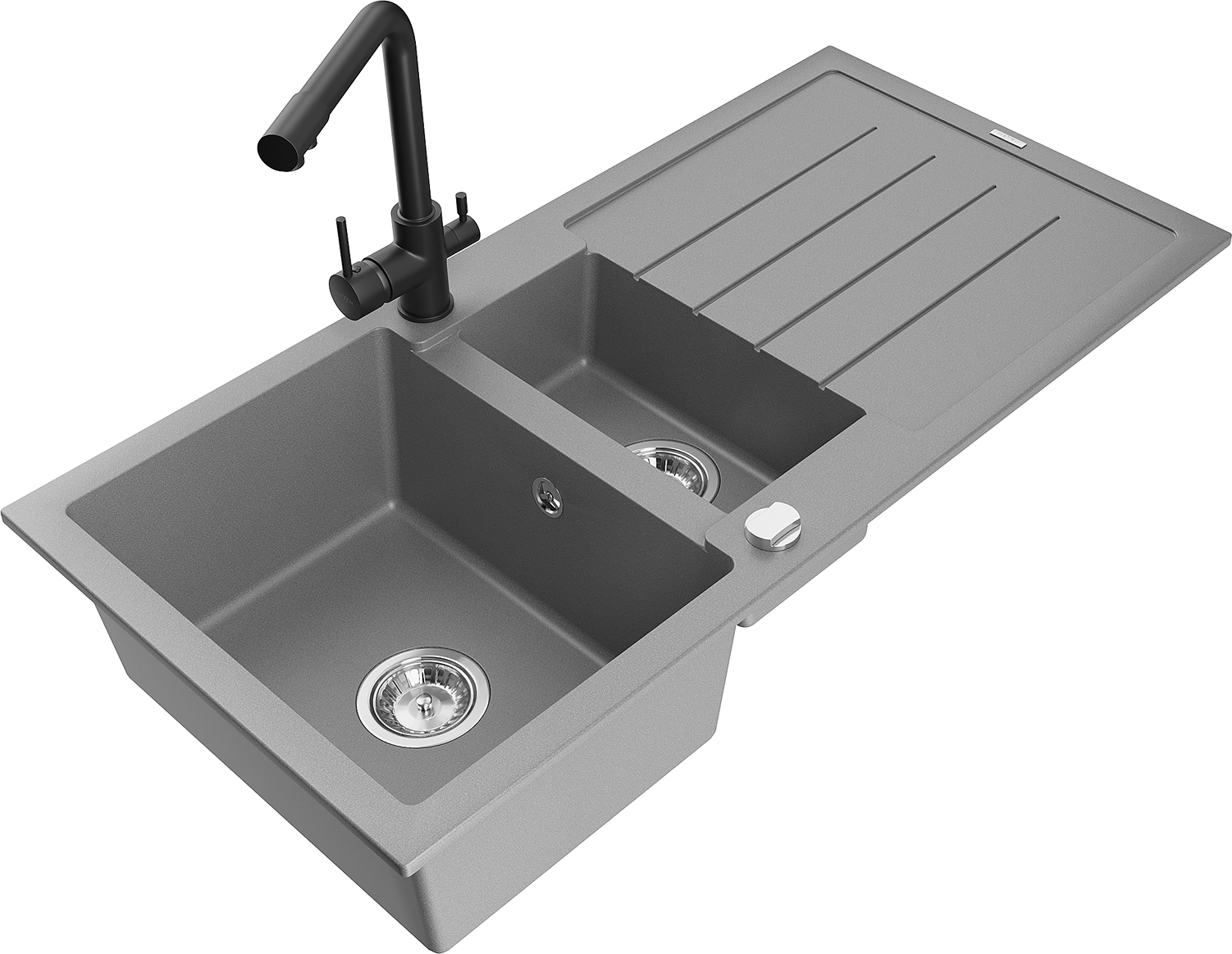 Mexen Andres 1,5 kamrás gránit mosogató csepegtetővel és Duero konyhai csapteleppel, szürke - 6515-71-671600-70