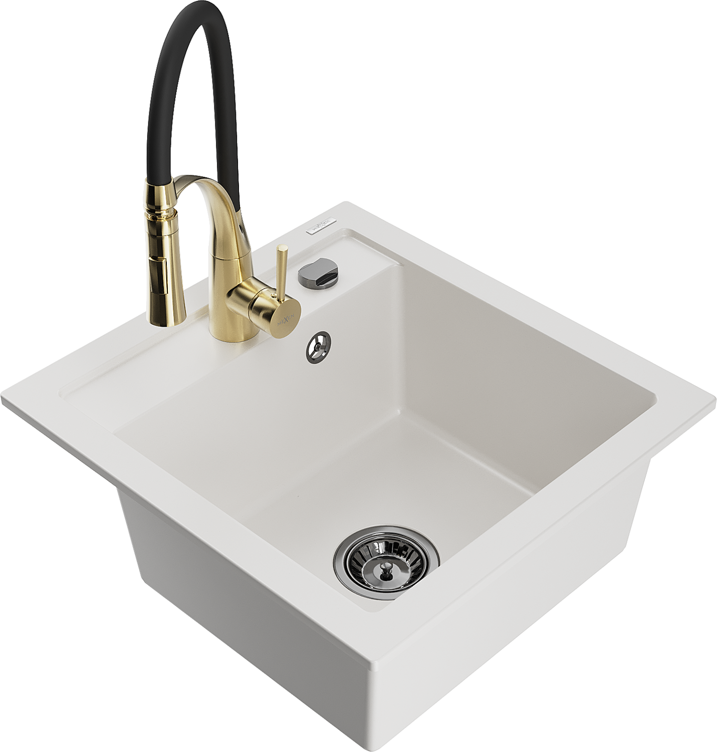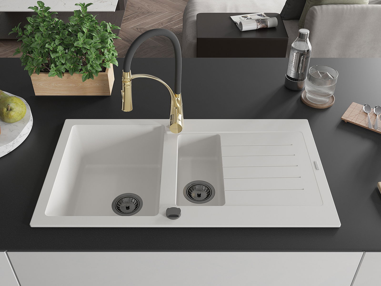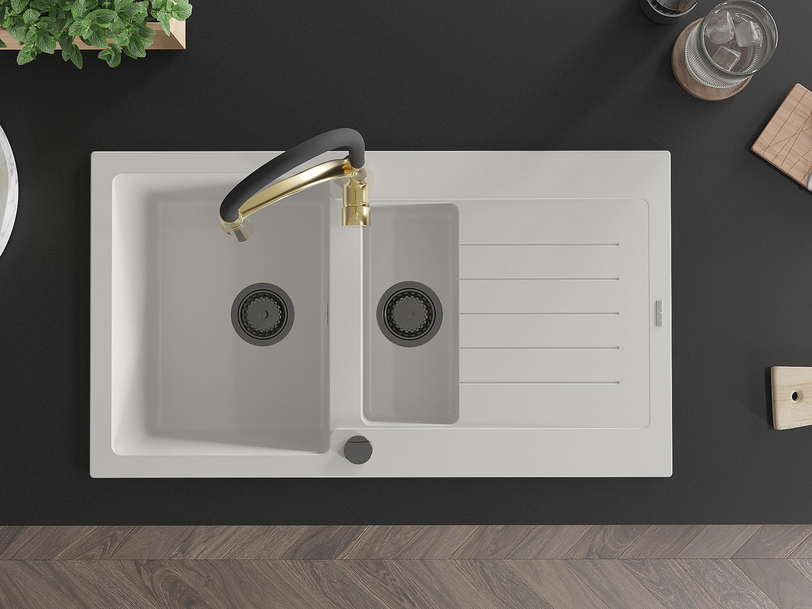 Mexen Matias 1,5 rekeszes gránit mosogató csepegtetővel és Aster konyhai csapteleppel, fehér - 6502-20-73450-57-B