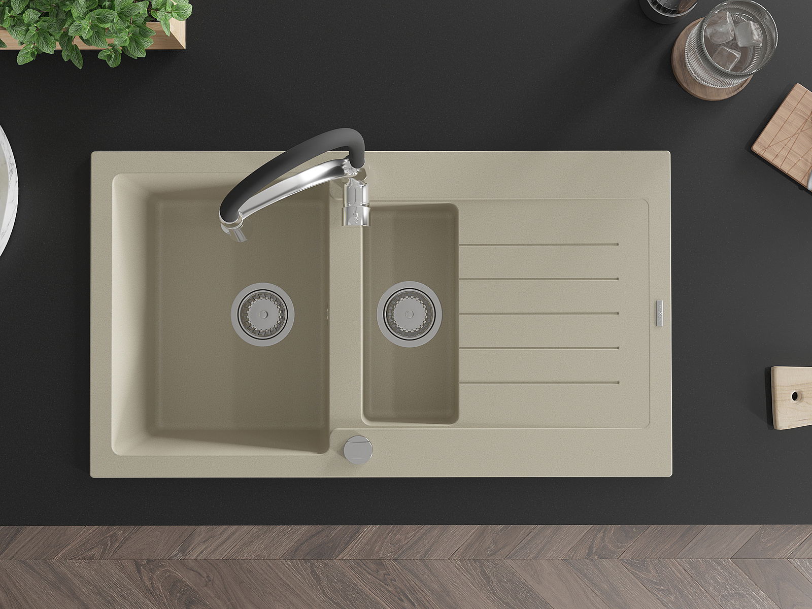 Mexen Matias gránit mosogató 1,5 medencés csepegtetővel és Aster konyhai csapteleppel, beige - 6502-69-73450-07