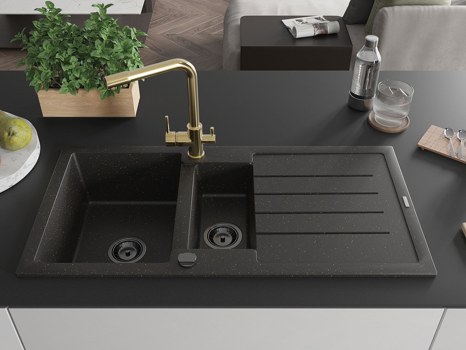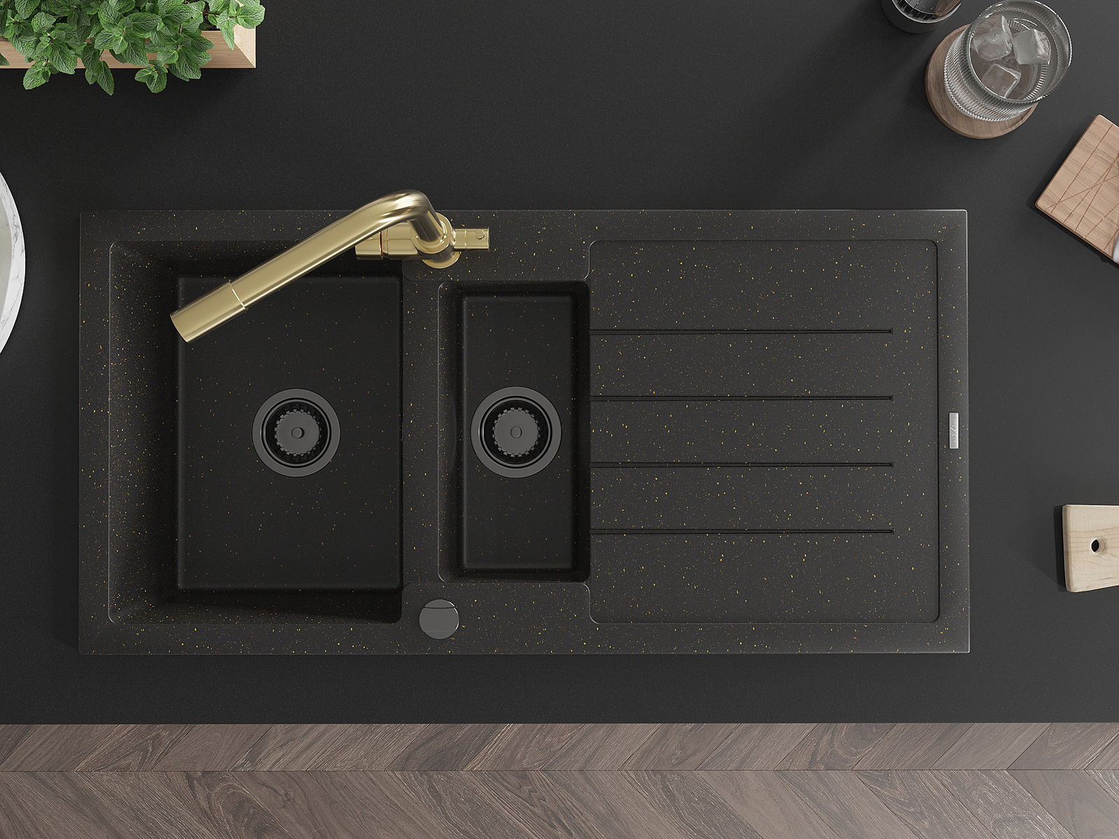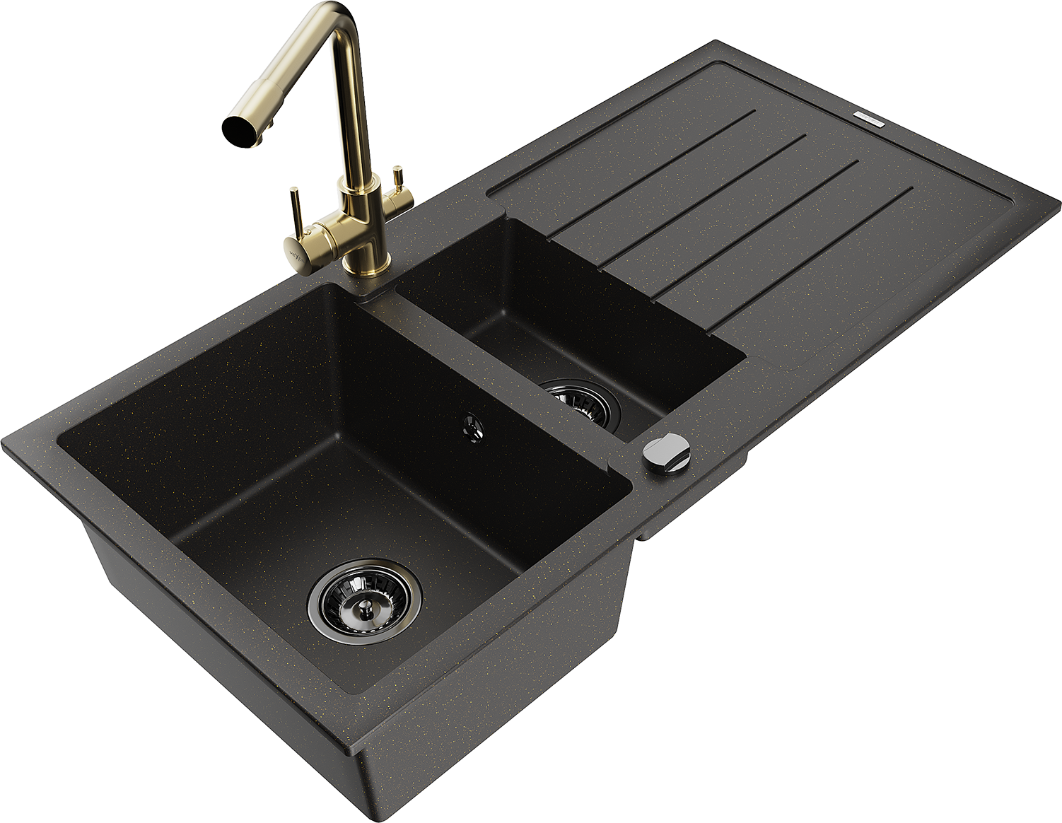 Mexen Andres gránit mosogató 1,5 rekeszes csepegtetővel és Duero konyhai csappal, fekete/arany - 6515-75-671600-50-B