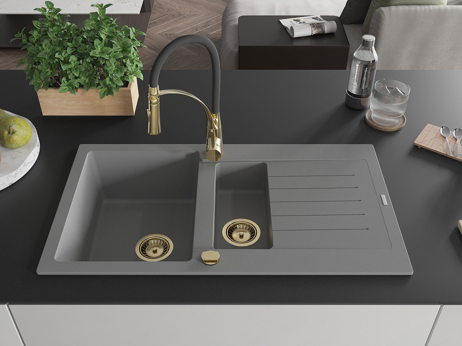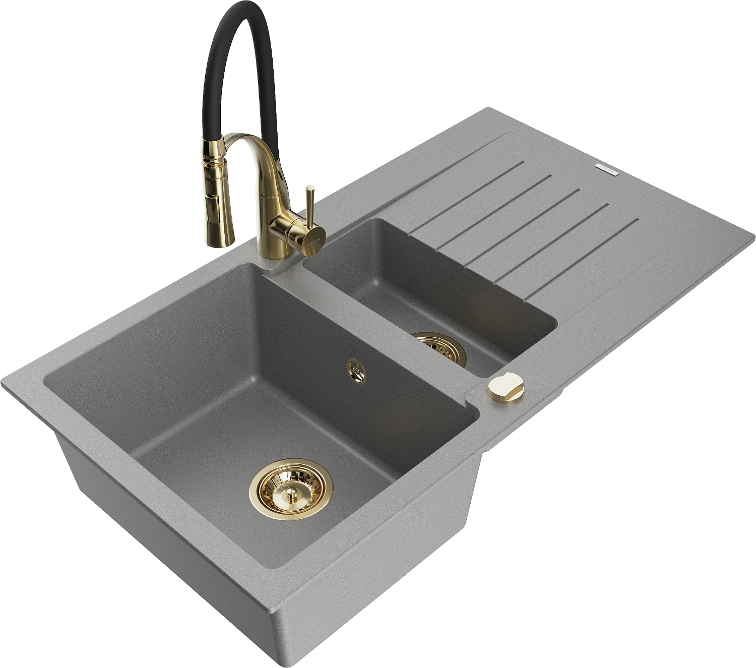 Mexen Matias gránit mosogató 1,5-öblítéses csepegtetővel és Aster konyhai csappal, szürke - 6502-71-73450-57-G