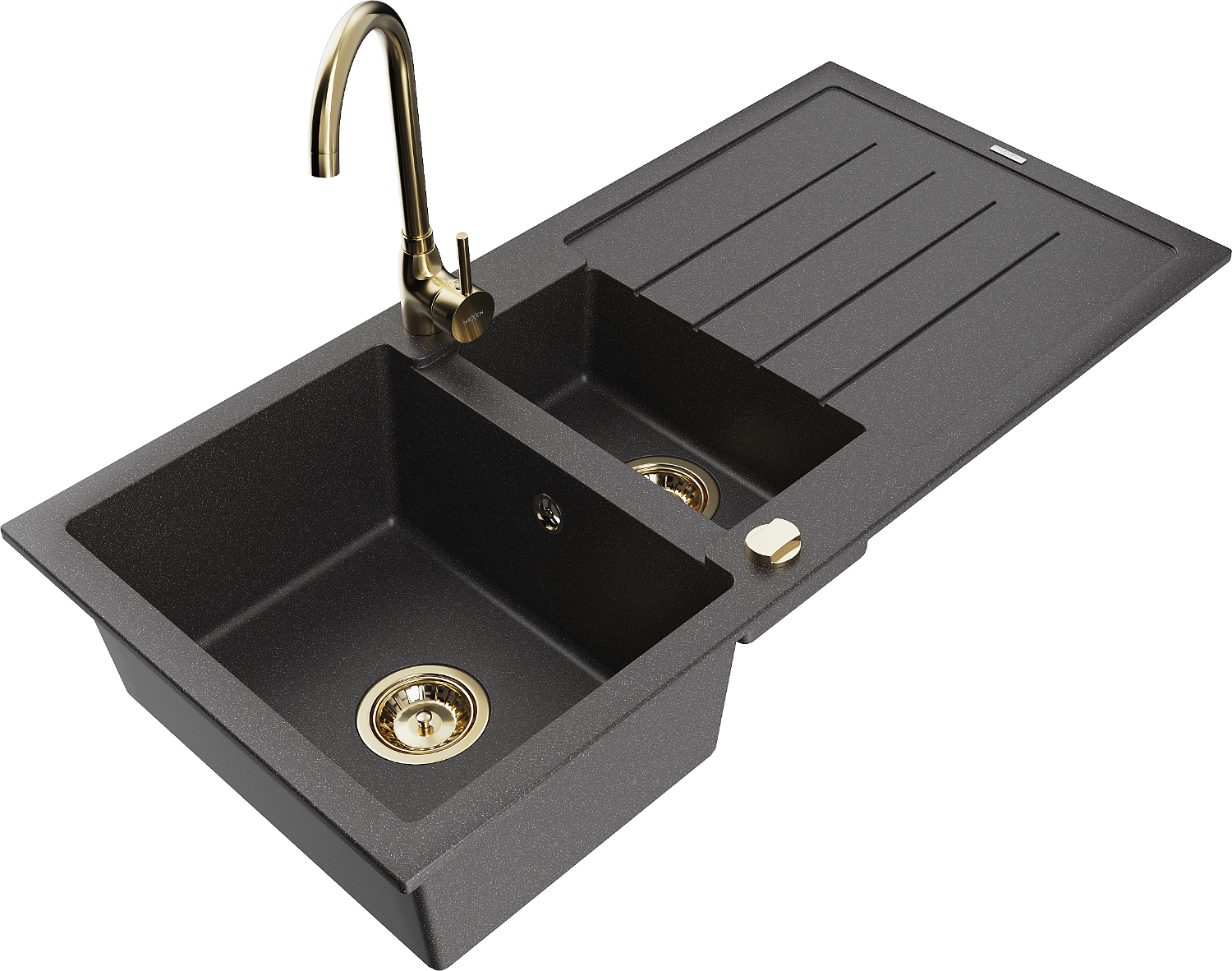 Mexen Andres 1,5-komorás gránit mosogató csepegtetővel és Telma konyhai csapteleppel, fekete pöttyös - 6515-76-670200-50