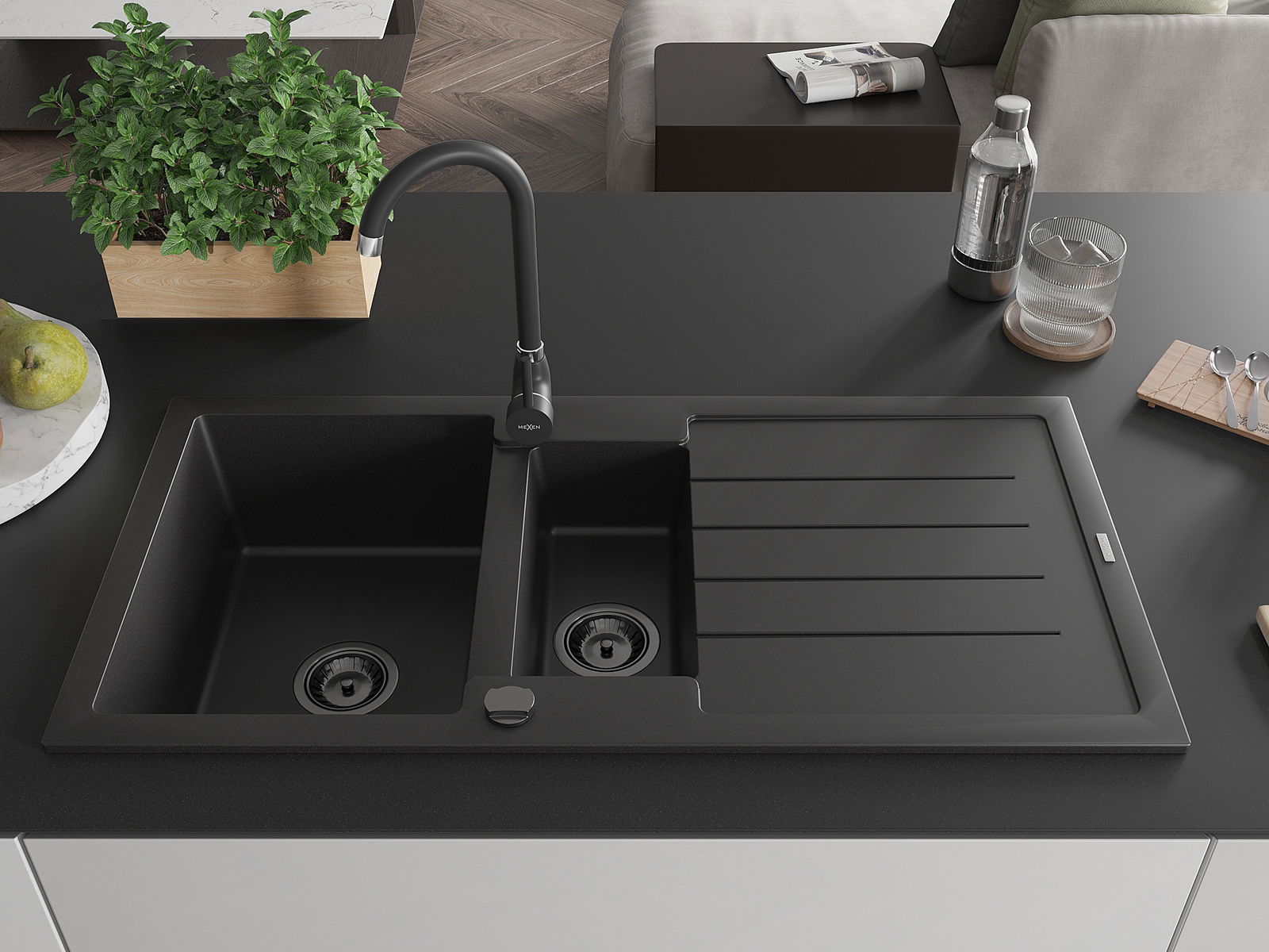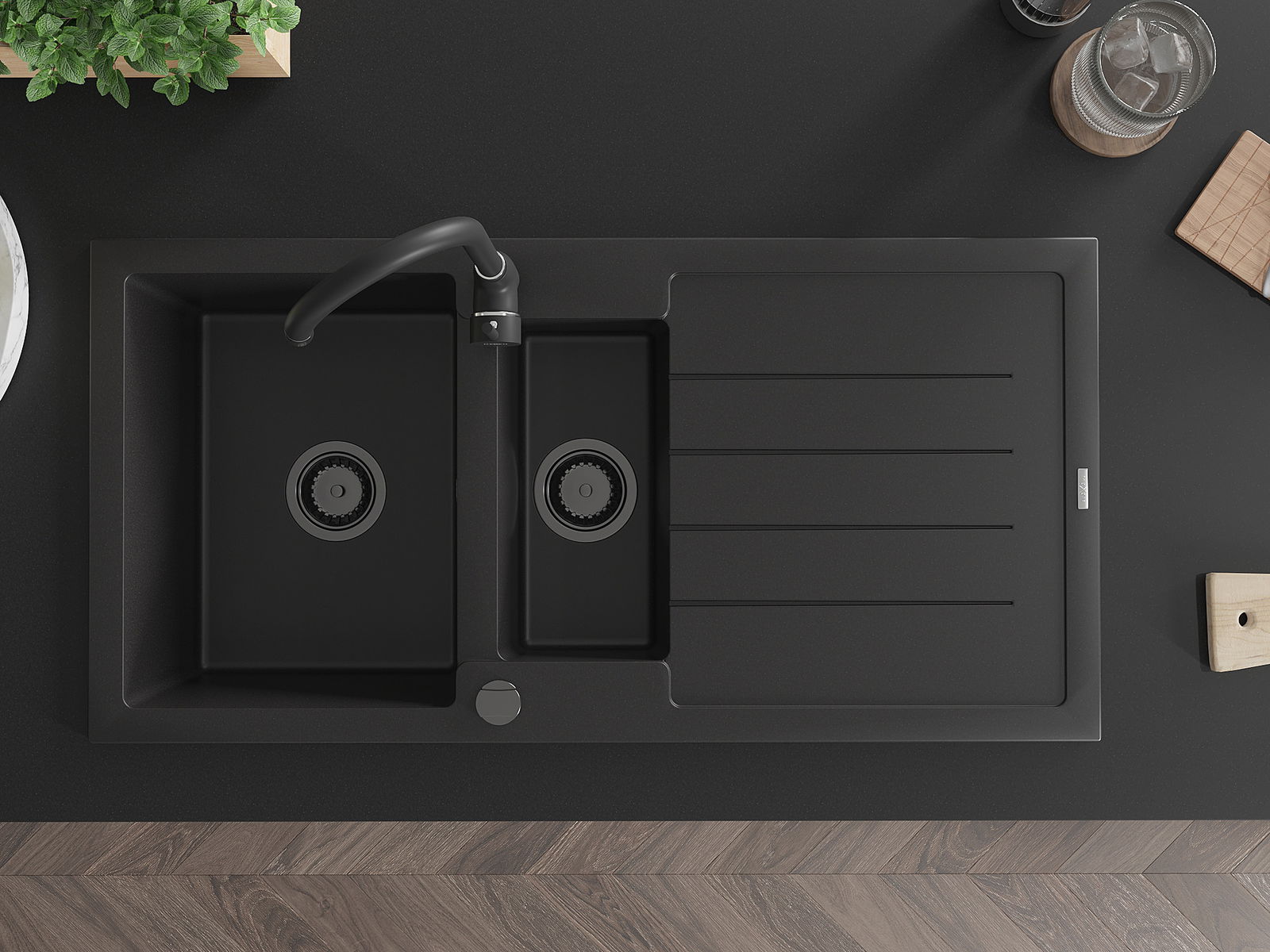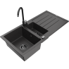Mexen Andres gránit mosogató 1,5 rekeszes csepegtetővel és Telma konyhai csappal, fekete - 6515-77-670200-70-B