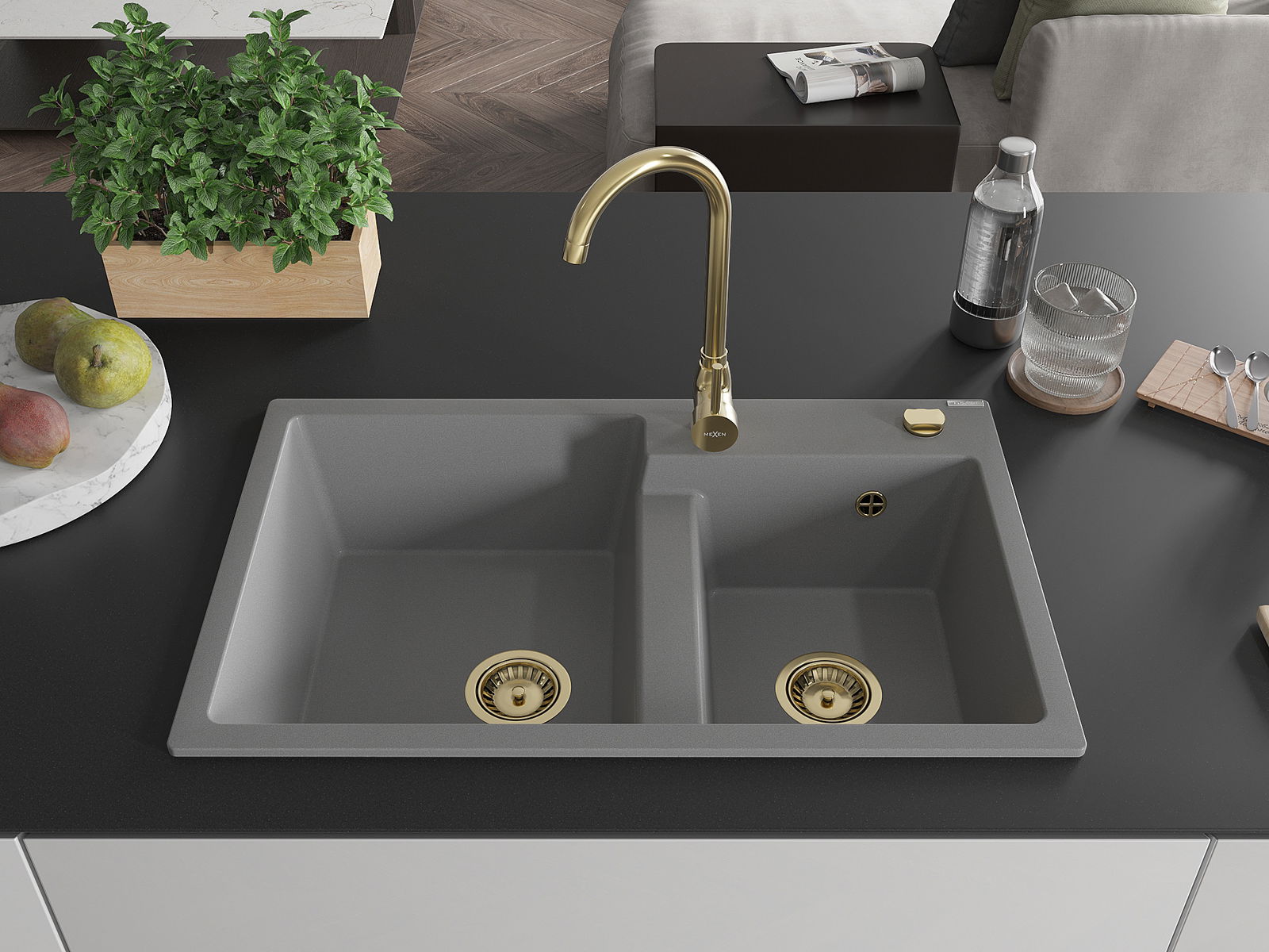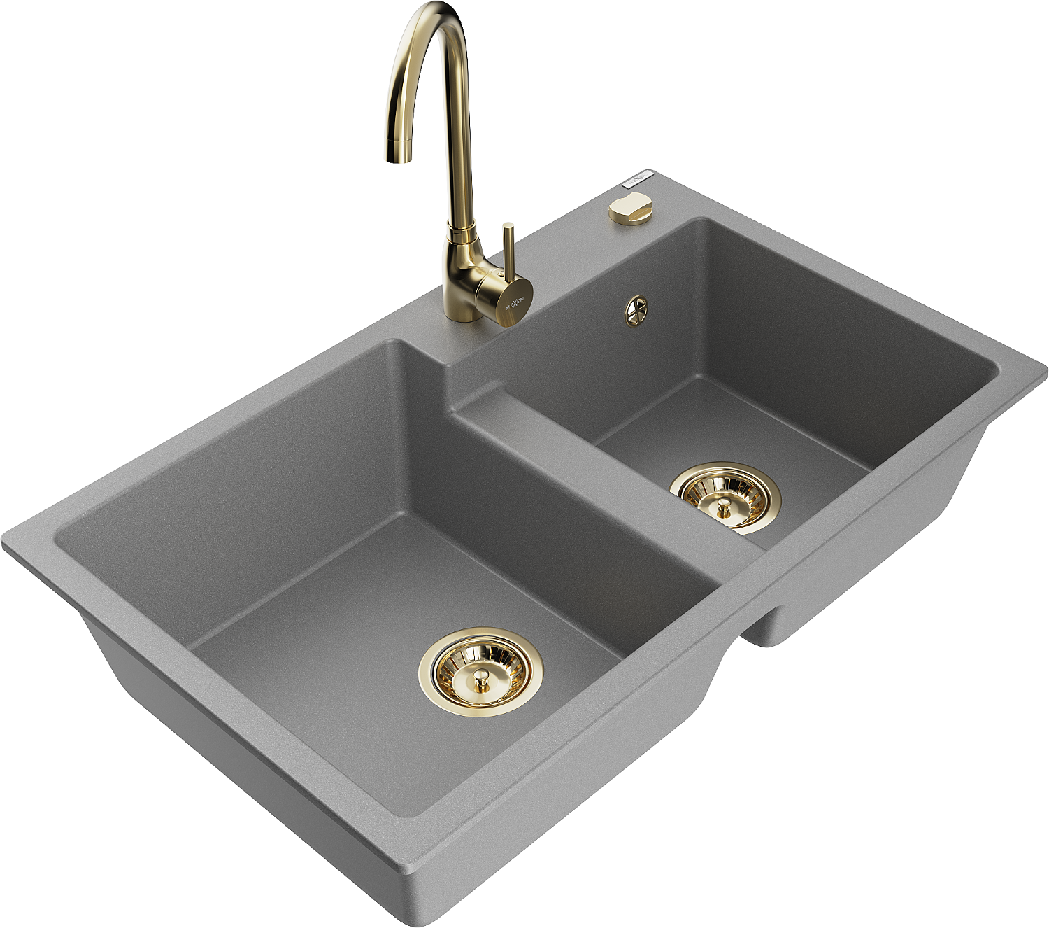Mexen Tomas gránit mosogató 2-medencés konyhai csapteleppel Telma, szürke - 6516-71-670200-50