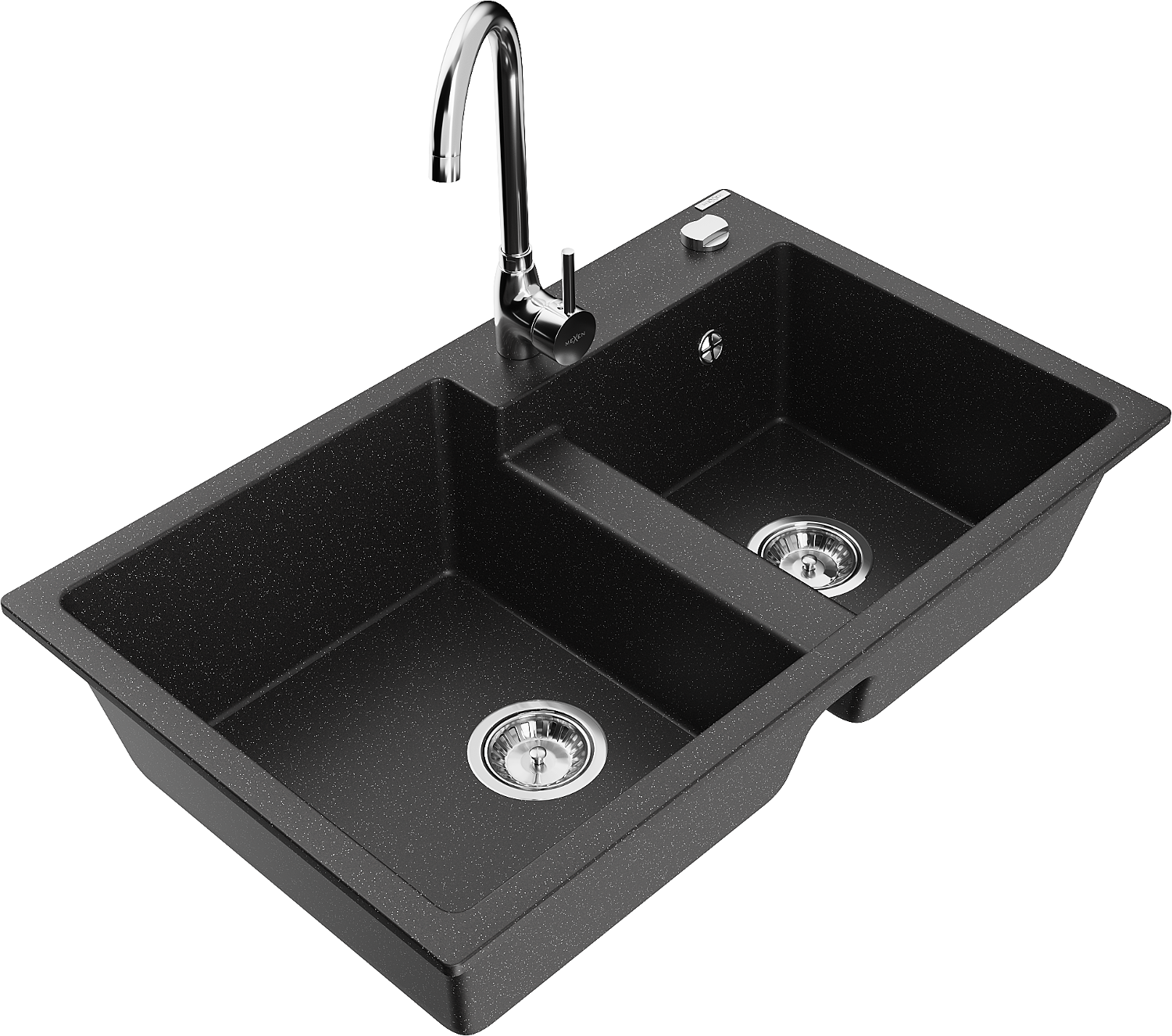 Mexen Tomas gránit mosogató kétmedencés konyhai csappal Telma, fekete/ezüst metál - 6516-73-670200-00