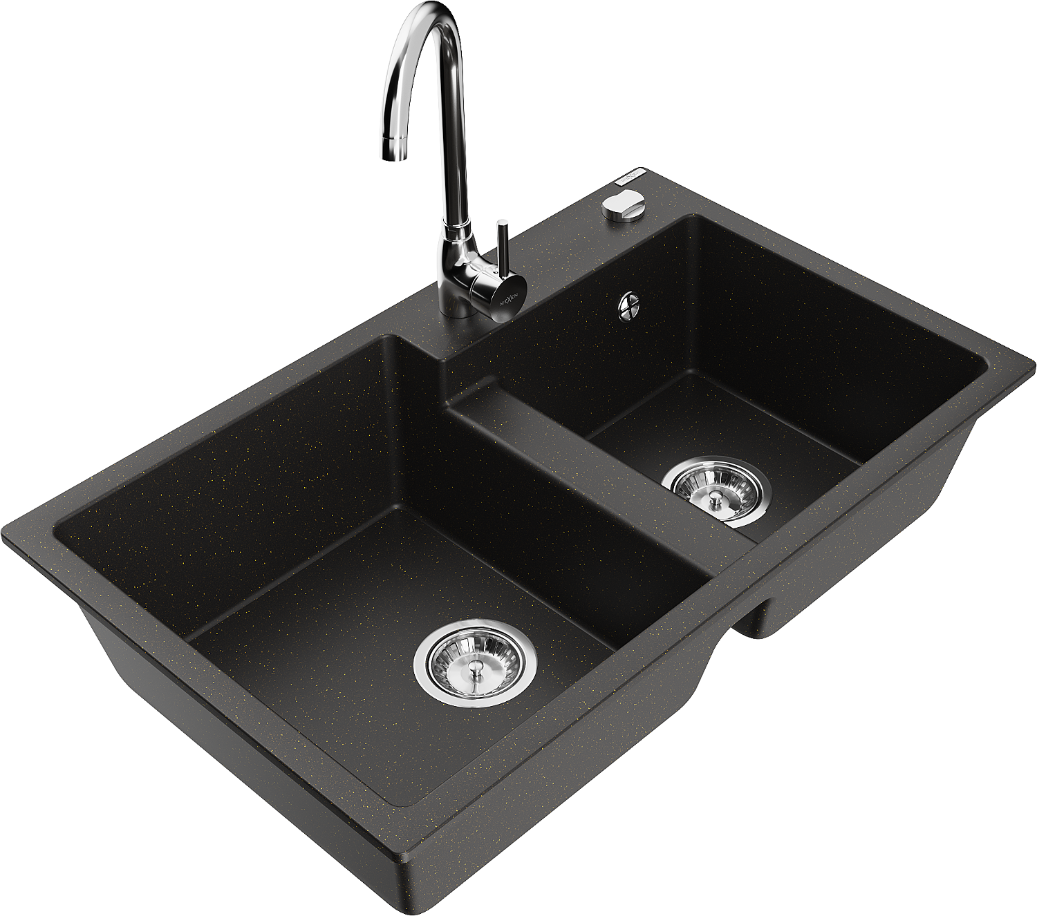 Mexen Tomas 2 kamrás gránit mosogató Telma konyhai csapteleppel, fekete/arany metál - 6516-75-670200-00