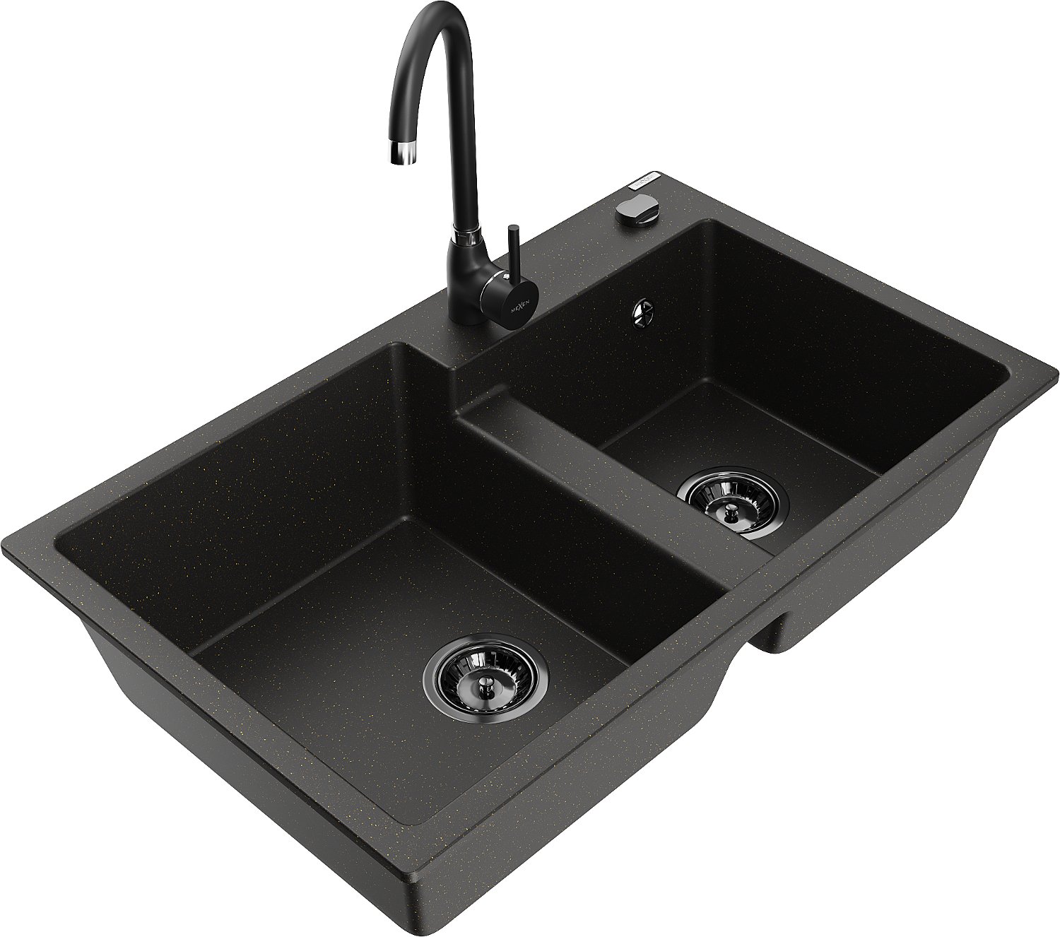 Mexen Tomas gránit 2 medencés mosogató Telma konyhai csapteleppel, fekete/arany metál - 6516-75-670200-70-B