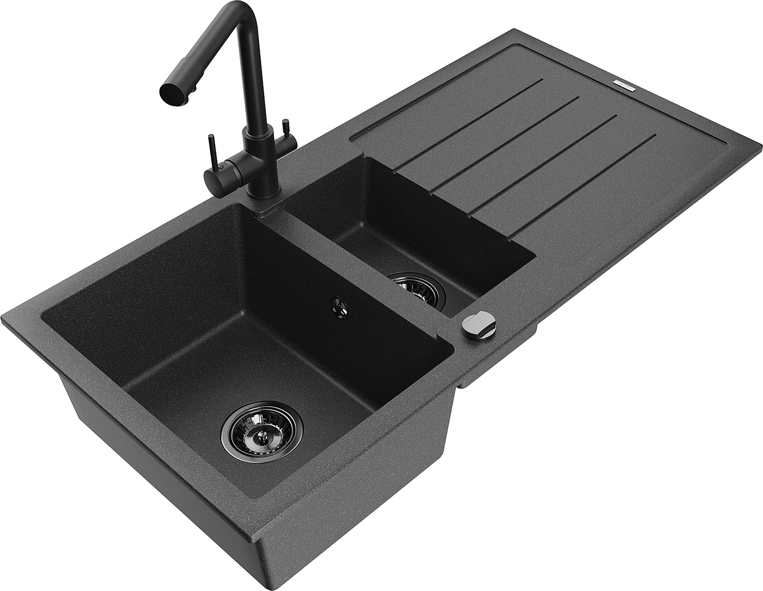 Mexen Andres gránit mosogató 1,5 medencés csepegtetővel és Duero konyhai csappal, fekete szórt - 6515-76-671600-70-B